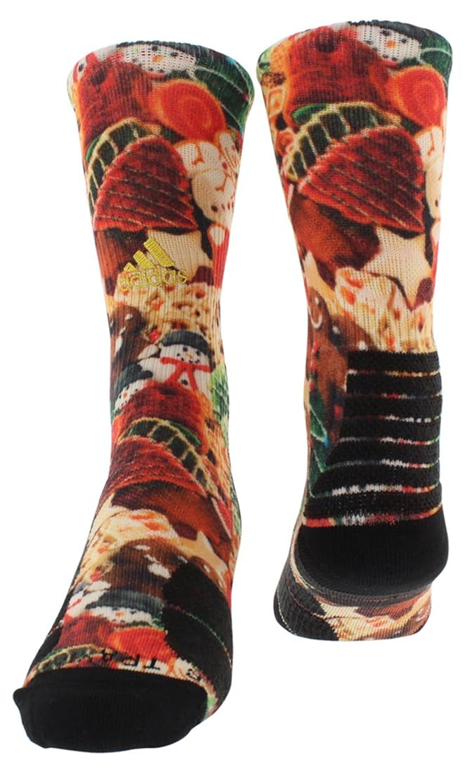 Ribbed crew socks with allover photographic holiday themed print and embroidered Adidas brandmark logo on outer legs. Arch and ankle compression for added support and Climalite moisture wicking fabric. Formotion left and right specific designed feet. Traxion cushioned footbed and Achilles |