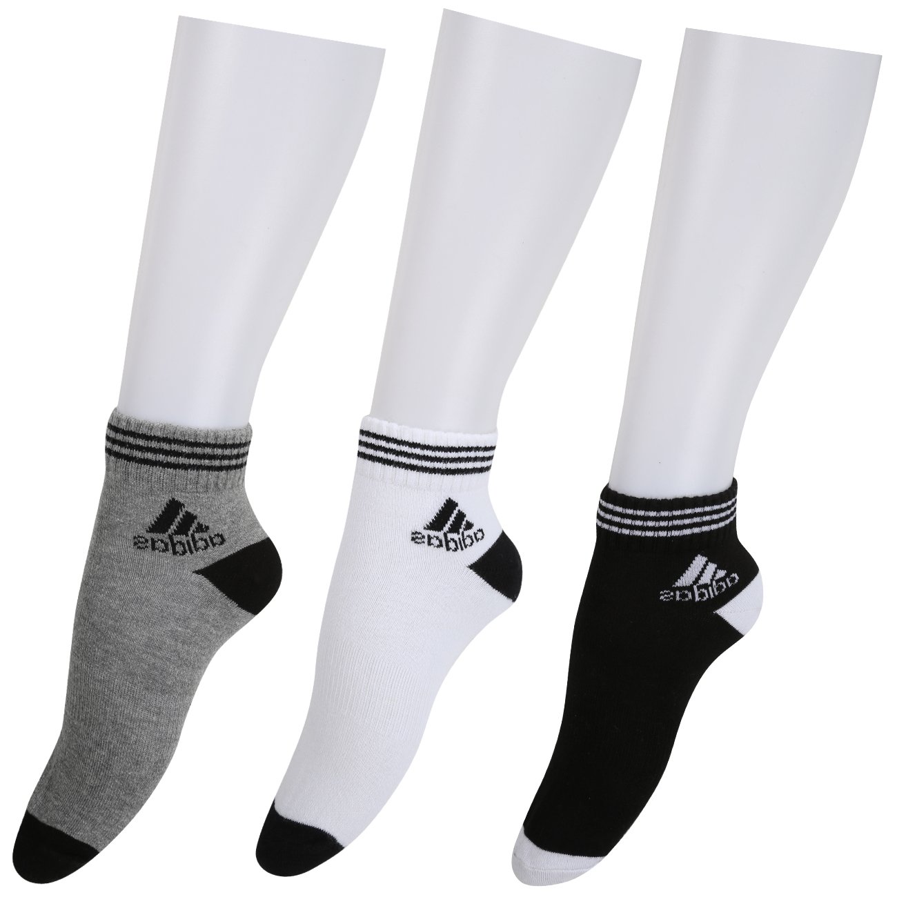 Comfortable and stylish, these socks from Adidas will surely become your favourite. They can be worn during their training sessions. Product Details Set of three training above ankle-length socks in black, white and grey melange Each has a brand logo and Adidas patented tri-stripes in a knitted pattern, a ribbed mouth and a flat toe seam |