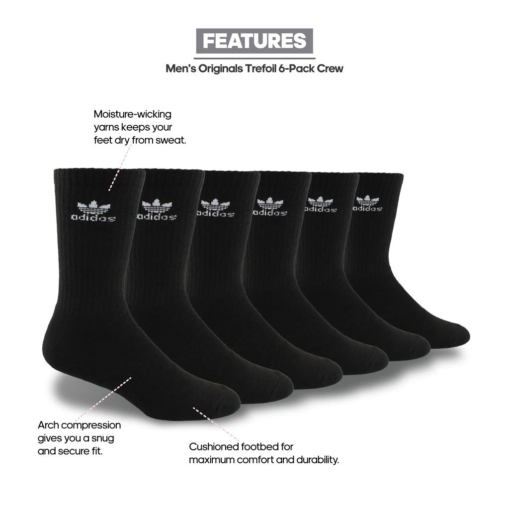 Originals Trefoil Crew Sock are lightweight and durable. They also feature an Adidas logo, reinforced heel and toe for enhanced durability, Climalite fabric, and arch compression. (6 pairs of socks.) |