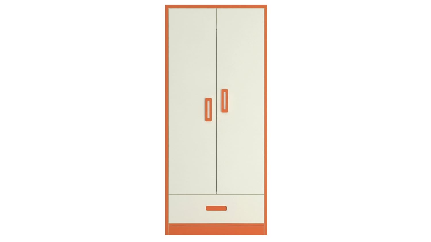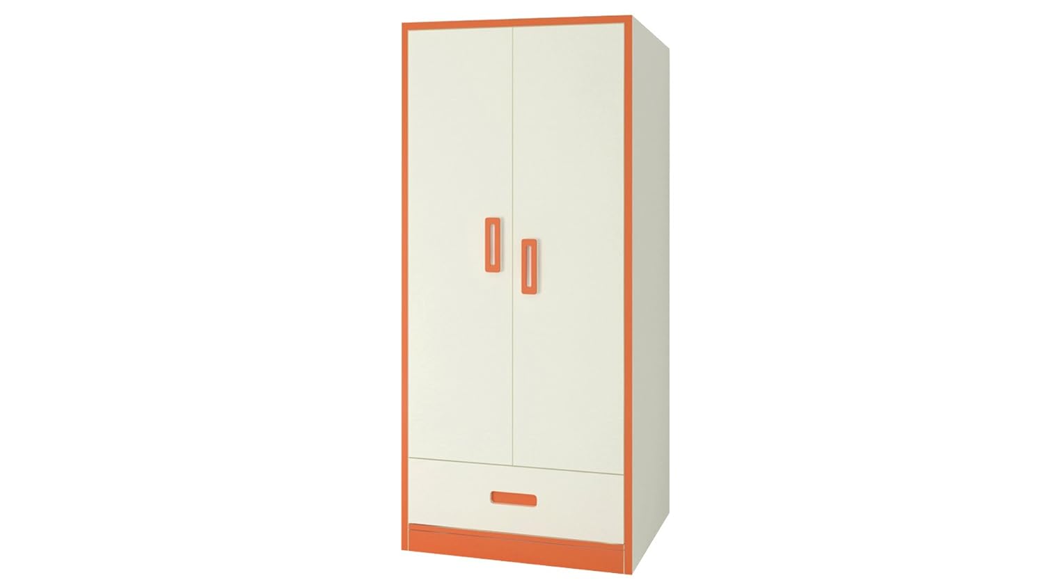 Soothing white colored spacious wardrobe with attractive colorful handles, sriking colorful border and a large drawer, good for clothes and other storage