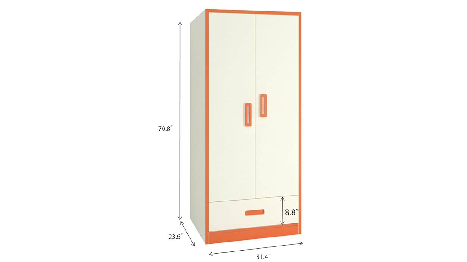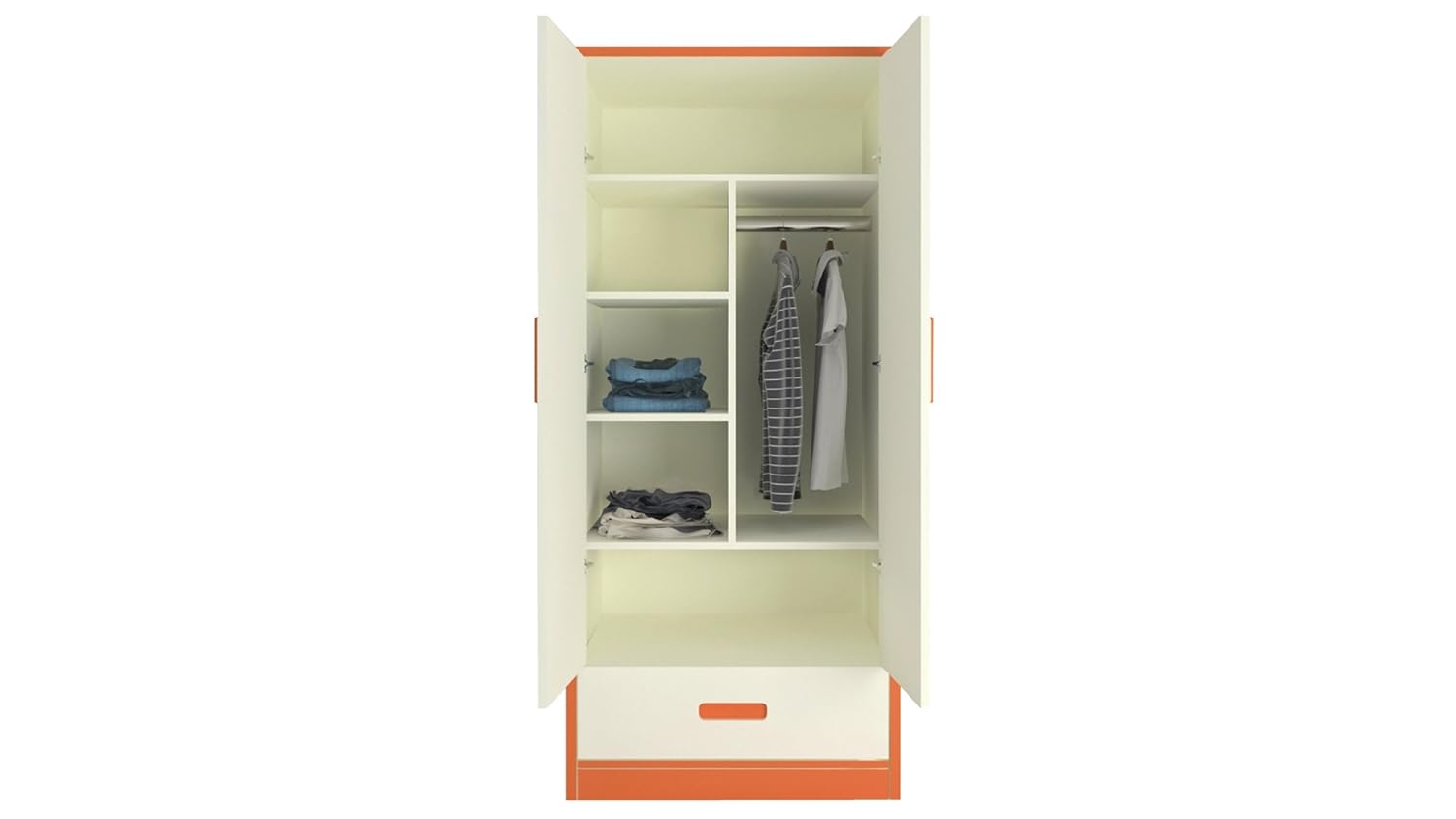 Spacious drawer, hang rod and shelves within offer ample versatile storage space