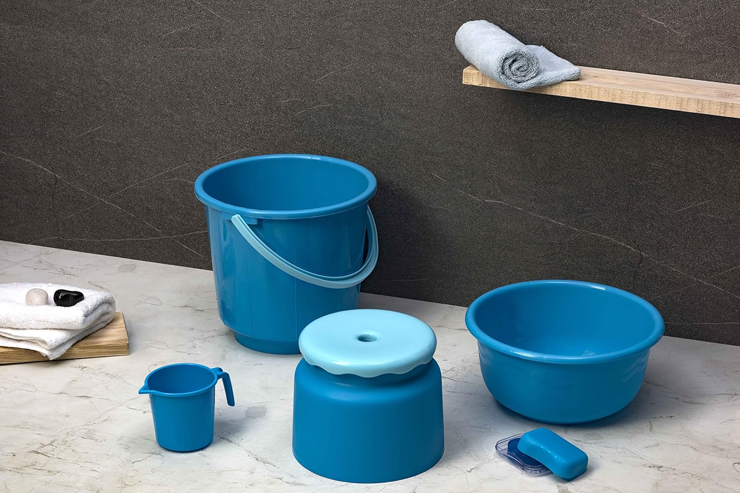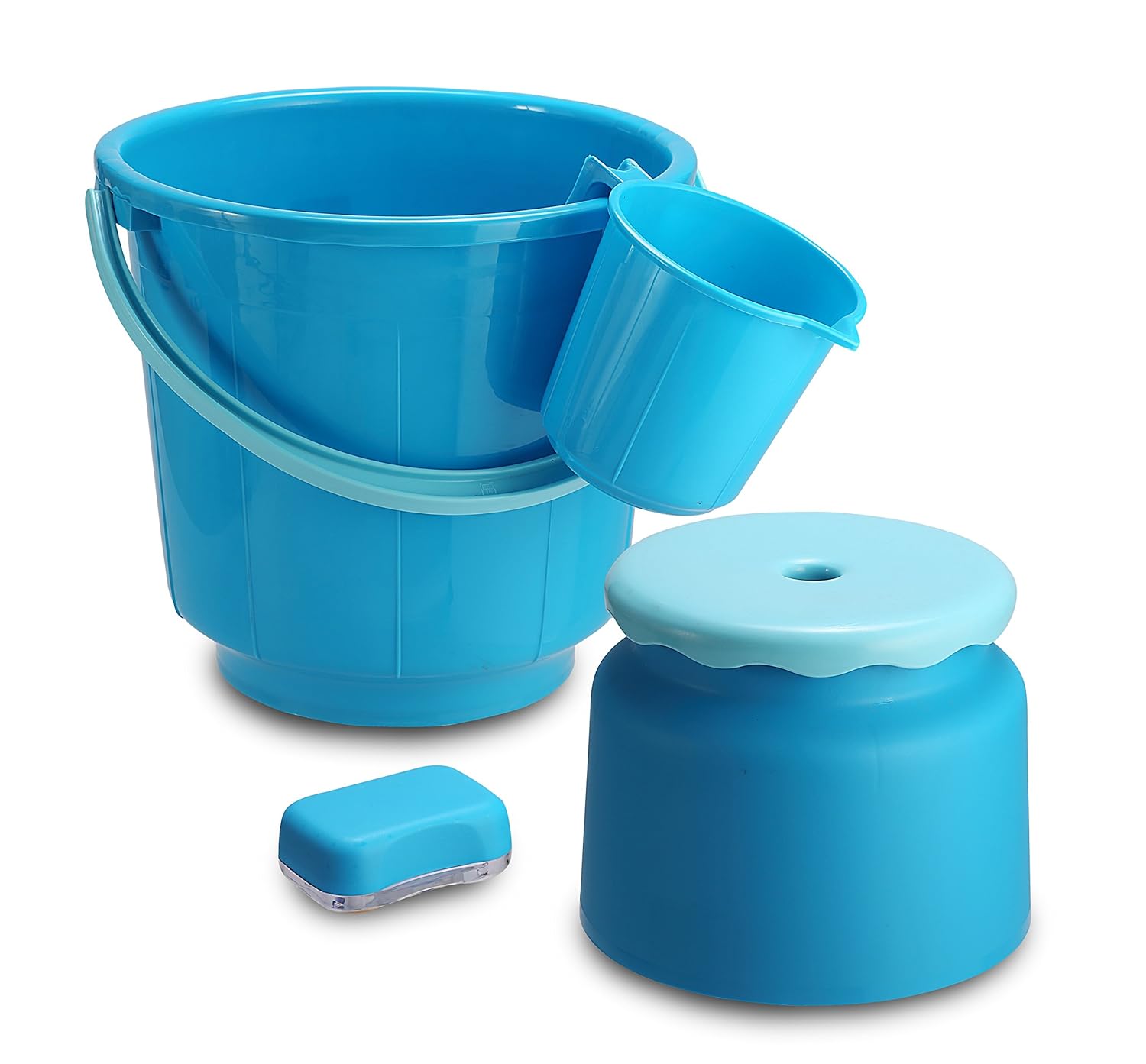 2 Buckets with Handles, 2 Mugs (1.5 Liters), 1 Soap Box, 1 Bathroom Stool, 1 Basin