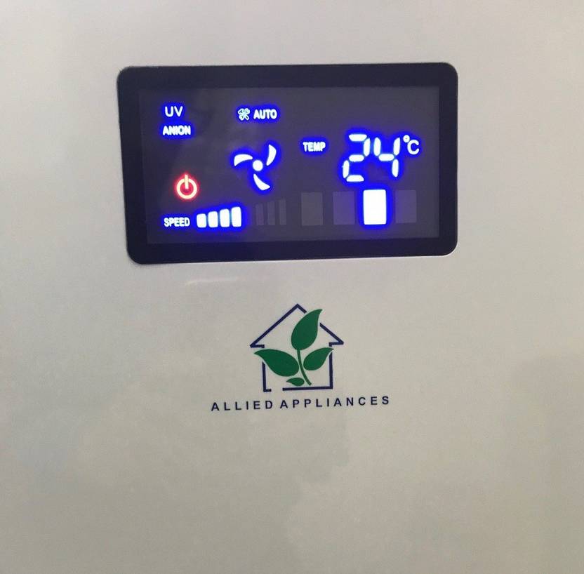 Elegant Design Allied Air purifier has HEPA technology Filters: UV ,Anion,Cold catalyst Filter,Hepa filter,Activated carbon Filter,Pre-filters Night sense mode (Quite Sleep Mode) Air clean range 60 m?2; Filter change alarm Power Consumption 45 watts 7 purification stage Air quality indicators Timer with automatic off Clean air delivery rate 300 m?3;/hr Noise minimum 20 DB maximum 59 DB Dust removal rate 99?cteria and Allergens removal rate 99.97% Indicator is there if any obstacle in Filter Remote Controlled Room Temperature Display LED Display Weight 6 Kg.