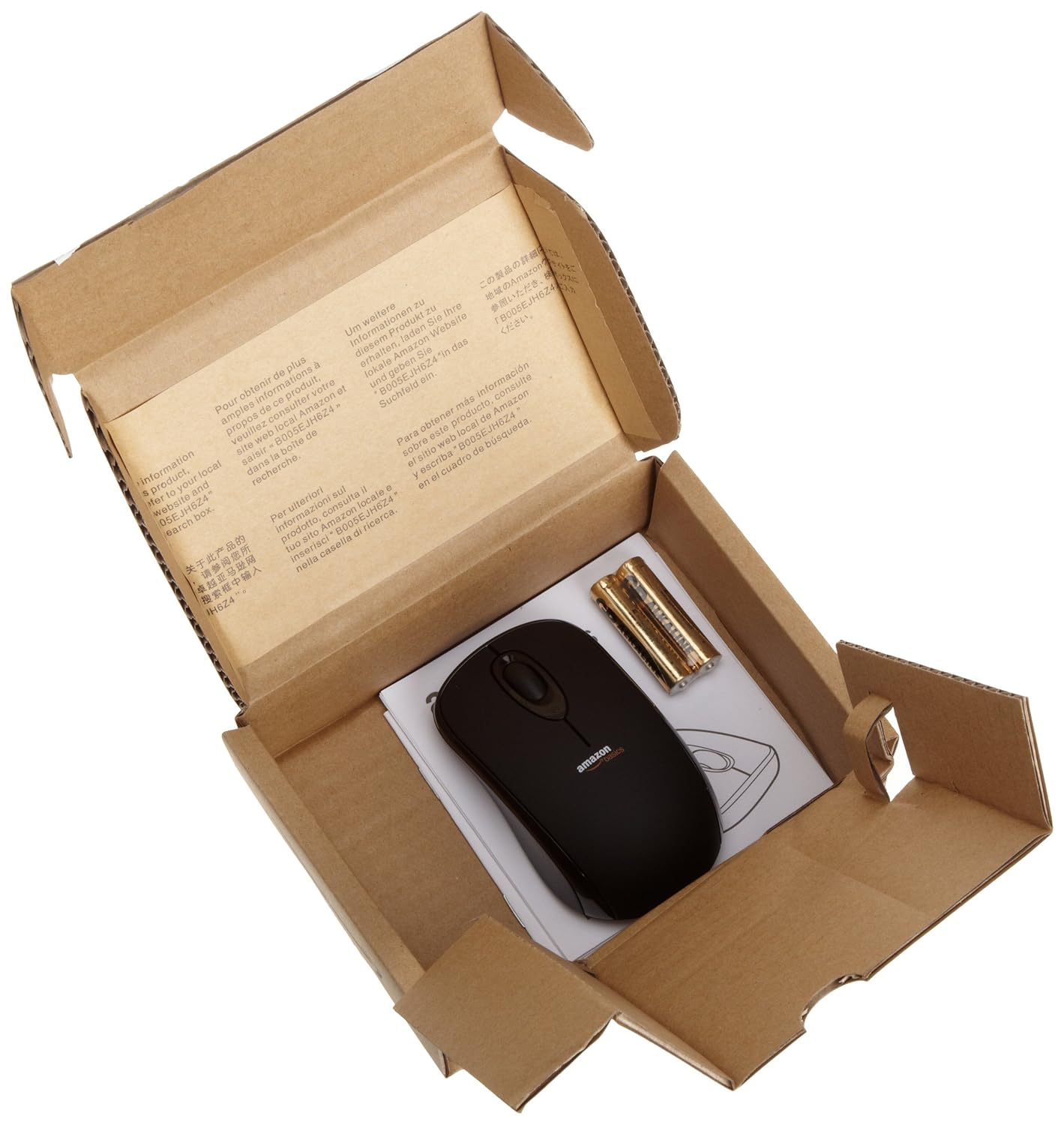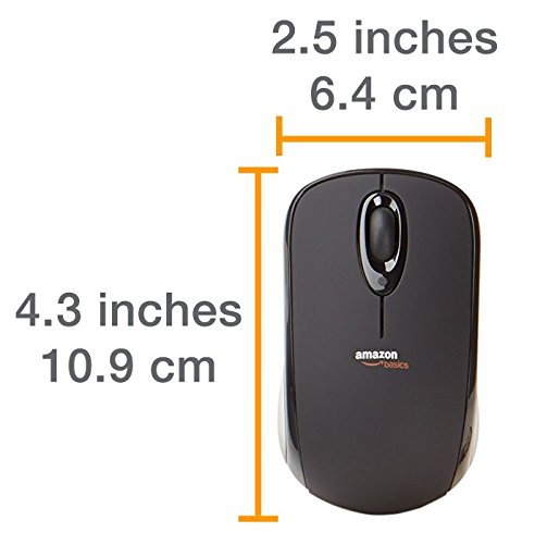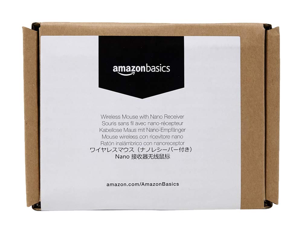 Wireless mouse with nano receiver (Black) From the Manufacturer This wireless, optical mouse features a tiny USB nano receiver. Just plug the receiver into your computer to use the mouse. When you're not using the mouse, leave the receiver plugged in or store it inside the mouse. So SimpleInsert the included batteries, plug in the nano receiver, and your mouse is ready to use. Comfort and StyleAmazonBasics wireless, optical mouse moves easily with or without a mouse pad. The soft-grip top and contoured sides make mousing a pleasure. Use the scroll wheel for fast, precise tracking to navigate through your work effortlessly. Be PreparedHaving your mouse batteries die unexpectedly when you're working on an important project won't happen again. The LED on the top of the mouse lights when your batteries are getting low. Amazon Frustration-Free PackagingThis AmazonBasics product features Amazon Frustration-Free Packaging that is recyclable. It comes without excess packaging materials such as hard plastic clamshell casings, plastic bindings, or wire ties. The packaging is designed to be opened without the use of a box cutter or knife, and it will protect your product just as well as traditional packaging. Products with Amazon Frustration-Free Packaging can frequently be shipped in their own boxes, without an additional shipping box, saving on resources and reducing waste. WarrantyAmazonBasics 1-Year Limited Warranty What’s in the BoxWireless mouse with nano receiver, 2 AAA batteries, Quick start guide, Instruction manual |