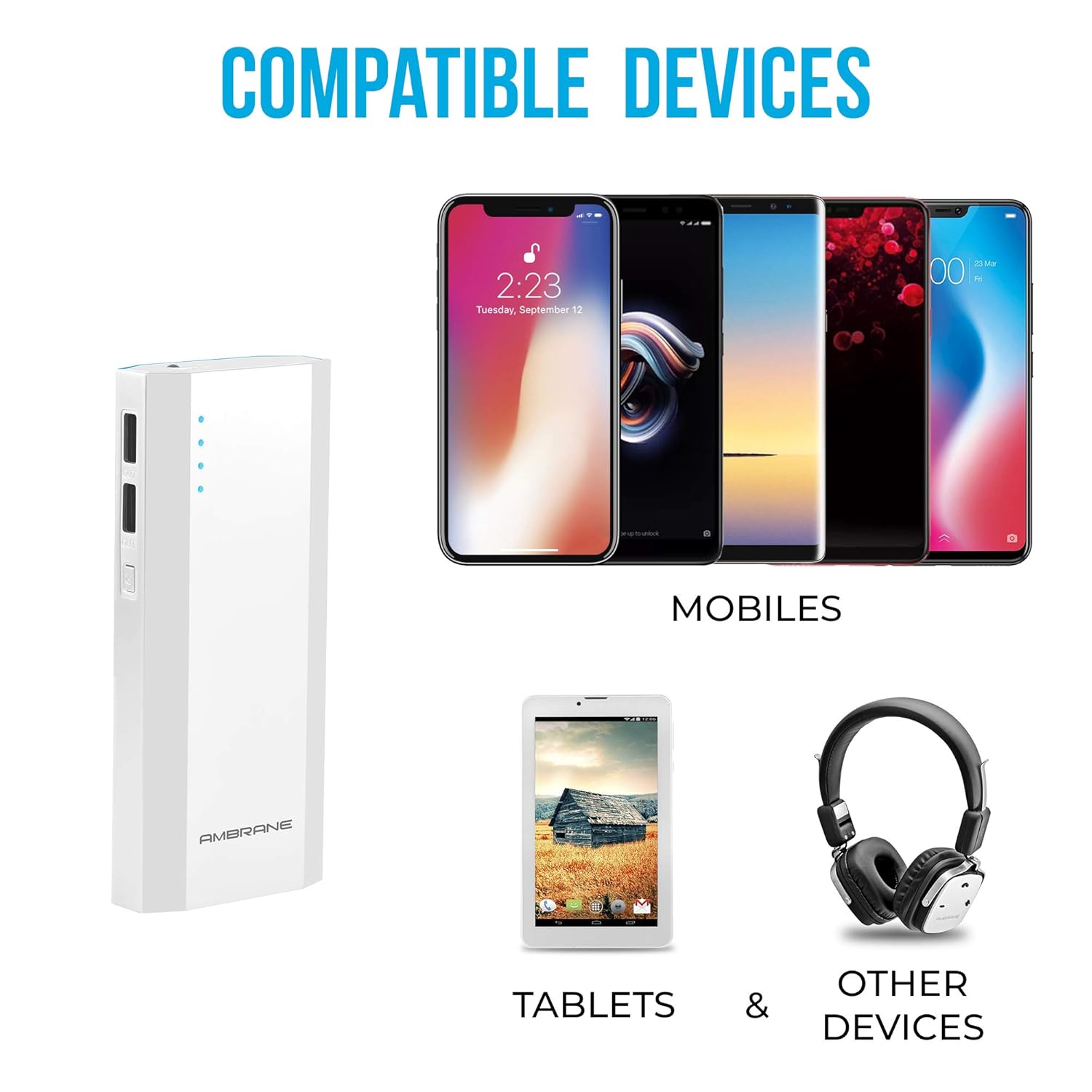 iPhone X: 2.3 full charges, Android phone MI A2 : 2.2 full charges, Tablet Samsung A 10.5: 0.9 full charges; Time taken to fully charge Android phone MI A2 : 2.3 hrs, iPhone X : 2 hrs, Tablet Samsung A 10.5: 5.5 hrs