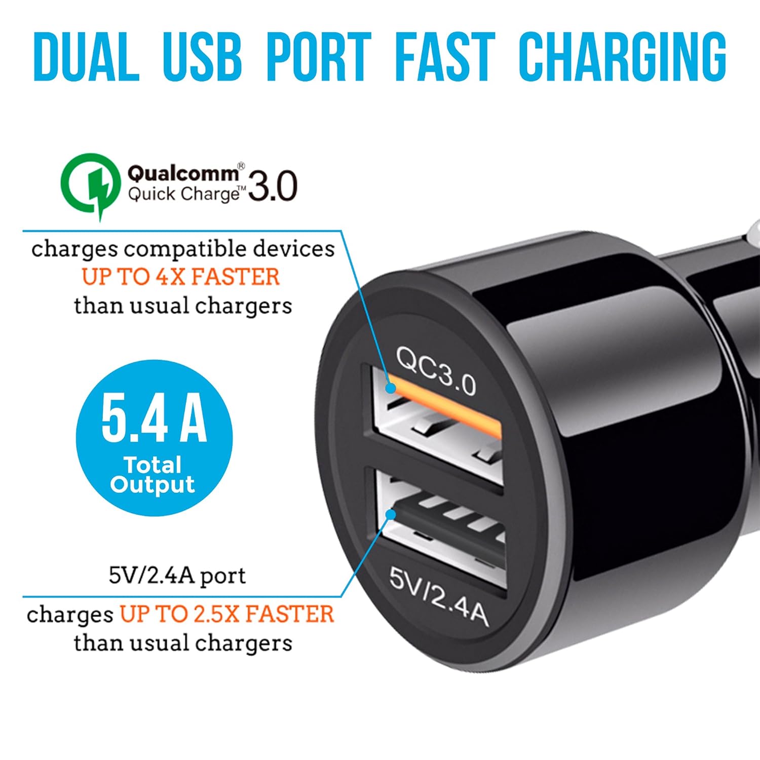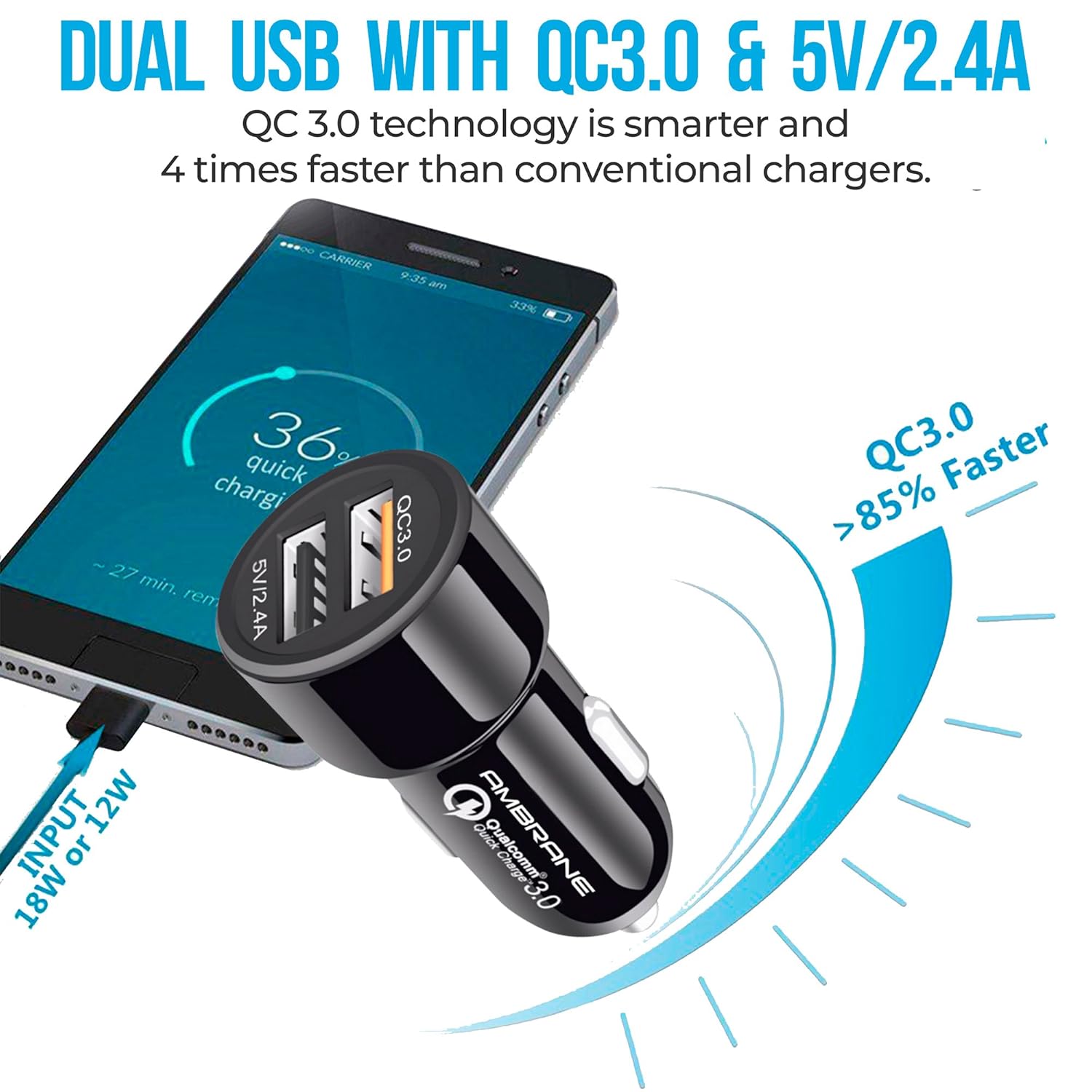 Fast Charging - The Ambrane Instant car charger having Qualcomm Quick Charge 3.0 technology, can charge the mobile devices up to 4 times faster as compared to other conventional car chargers