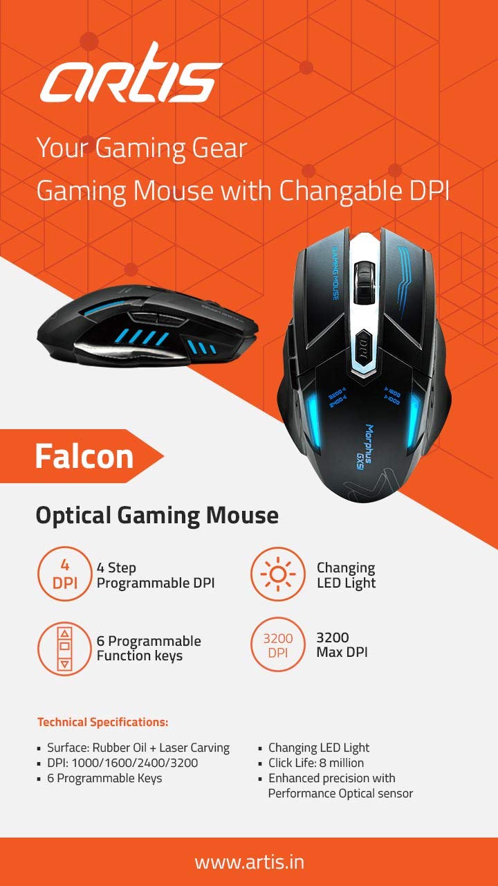 Falcon optical gaming mouse. Changing LED Light, 8 million, Enhanced precision with Performance Optical sensor. |