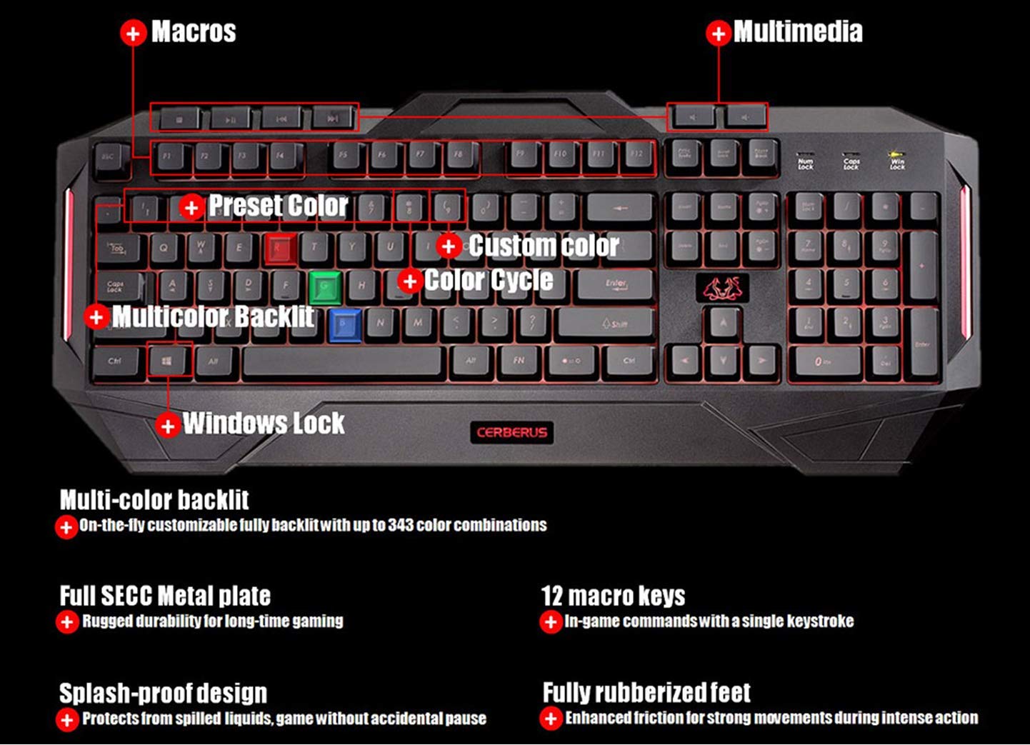 Cerberus MKII Gaming Keyboard features durable 20-million-keystroke lifespan membrane switches. Muliti-color LED-backlit provides you up to three illumination modes that can be customized via an intuitive interface. You can also create macros and shortcuts for all keys. Cerberus keyboard MKII lets you program up to 12 macros for complex in-game actions or commands. An integrated drain hole prevents liquids trapped inside the keyboard and easy cleanup after spills. |