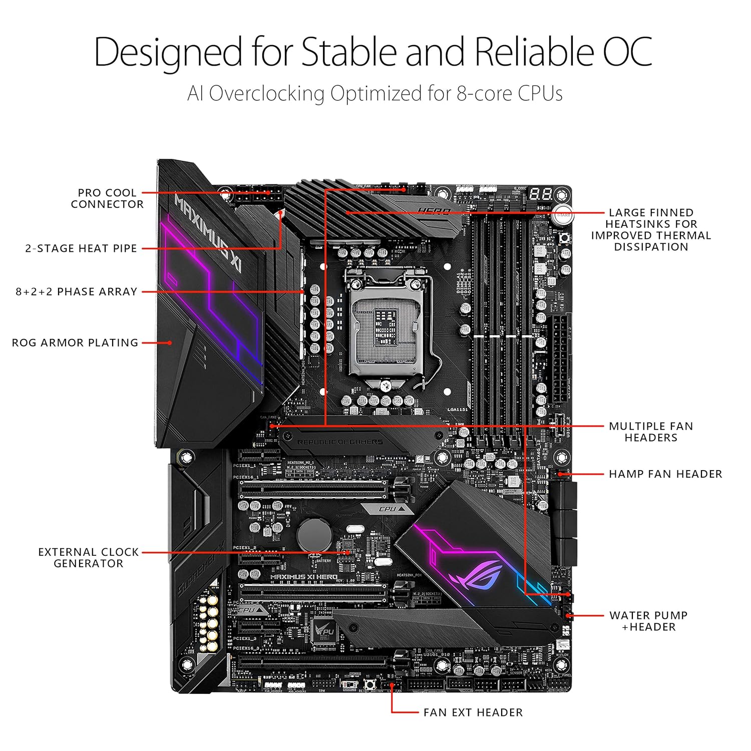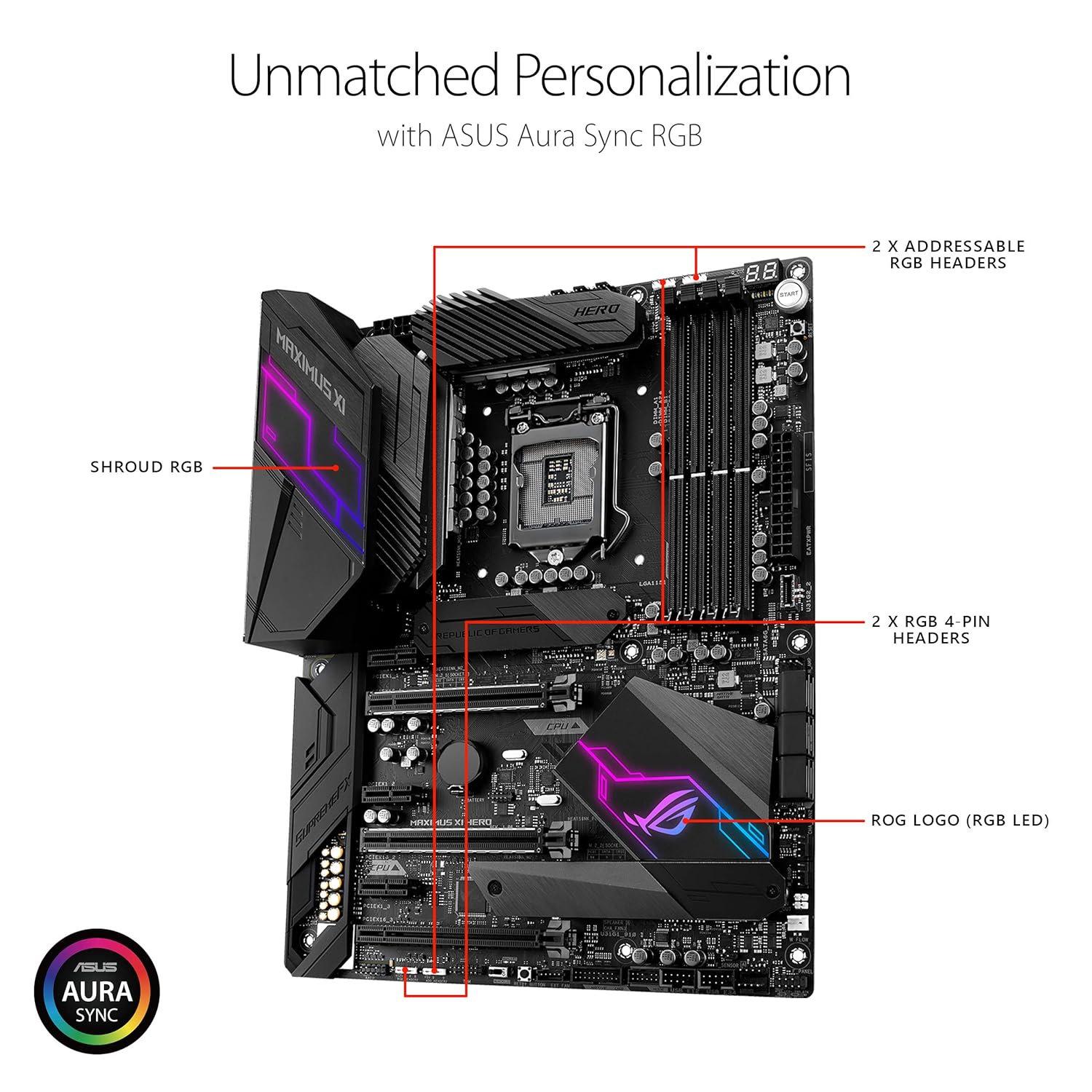 Load up with more Cores for more performance with the ROG Maximus XI Hero Wi-Fi, ready for 9th generation Intel Core processors. The revamped ASUS 5-Way Optimization overclocks intelligently based on smart prediction and thermal telemetry while FanXpert 4 delivers dynamic system cooling. Aura Sync with addressable headers features full RGB customization. |