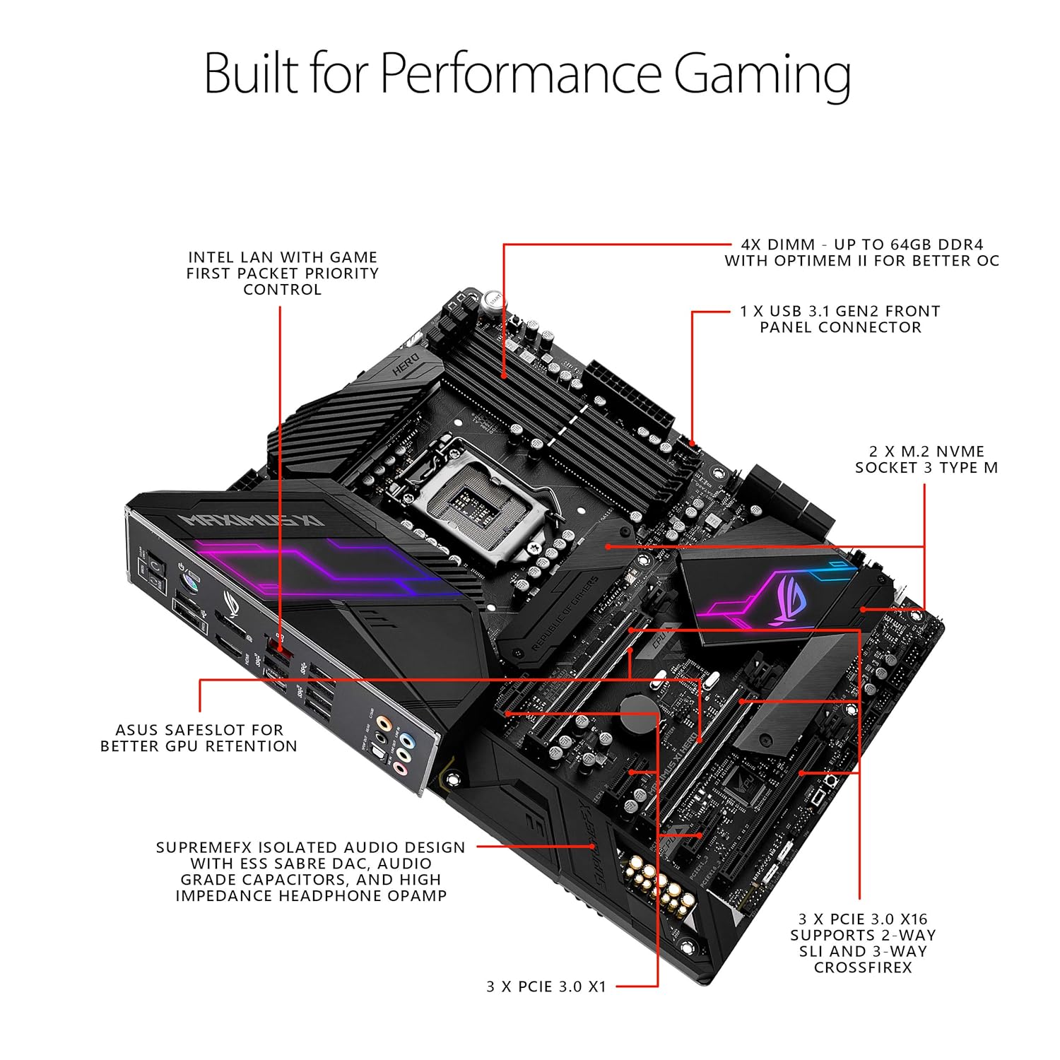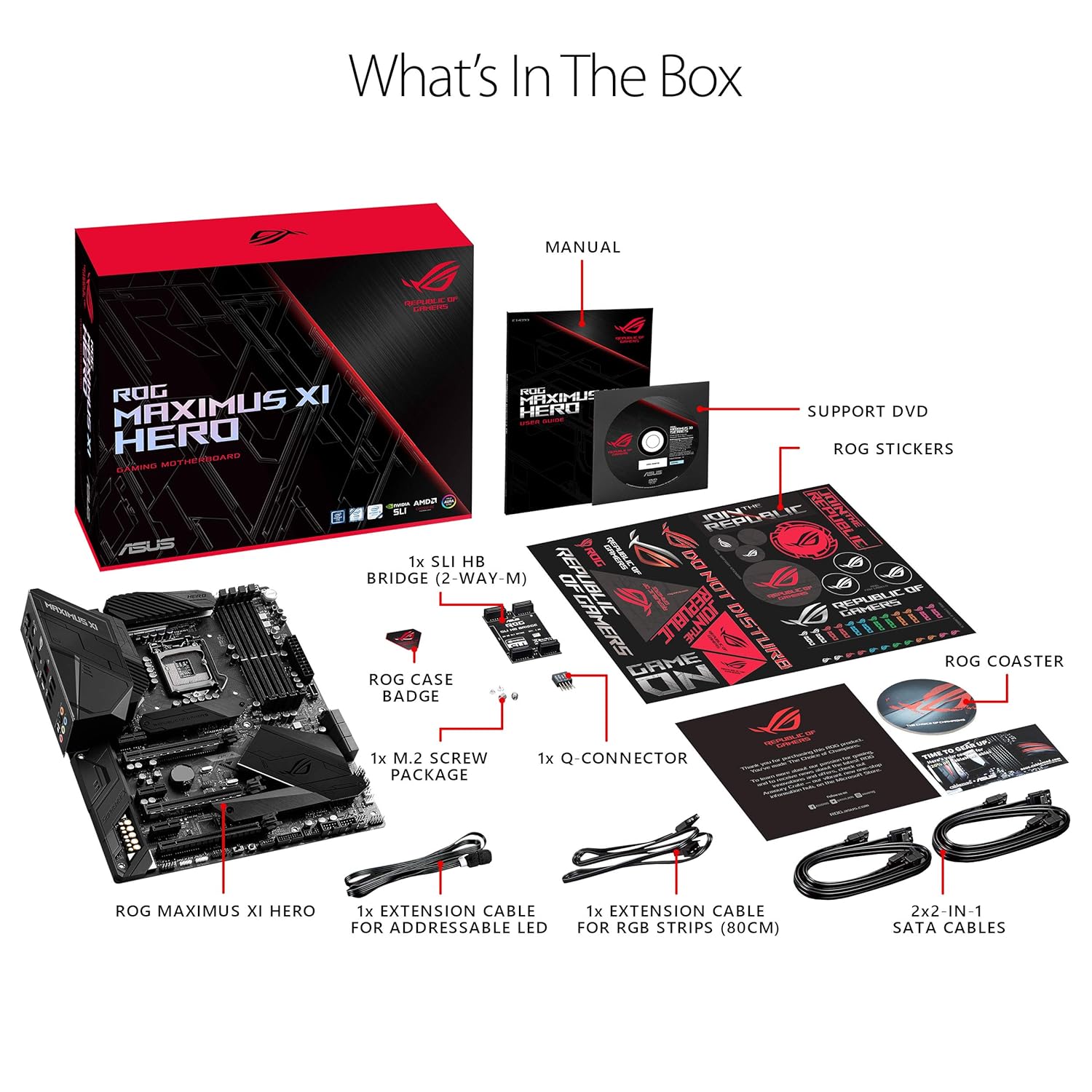 | Included Components | ROG MAXIMUS XI HERO gaming motherboard, User guide, ROG motherboard support DVD, 2-in-1 SATA 6Gb/s cables (2), Extension Cable for RGB strips, Extension Cable for RGB Addressable strips, SLITM HB bridge (2-way-M), Q-Connector, ROG Coaster, M.2 screws package, ASUS 2x2 dual band Wi-Fi antenna (Wi-Fi 802.11a/b/g/n/ac compliant), ROG Thank you card, ROG sticker, 128 Mb Flash ROM, UEFI AMI BIOS, PnP, DMI3.0, SM BIOS 3.1, ACPI 6.1 |