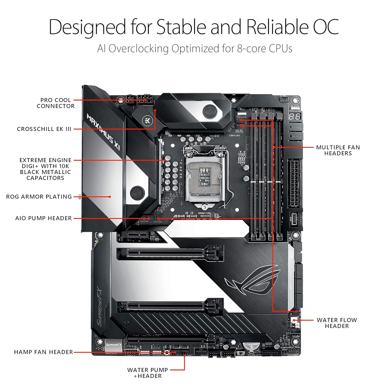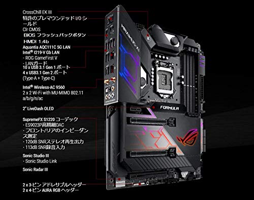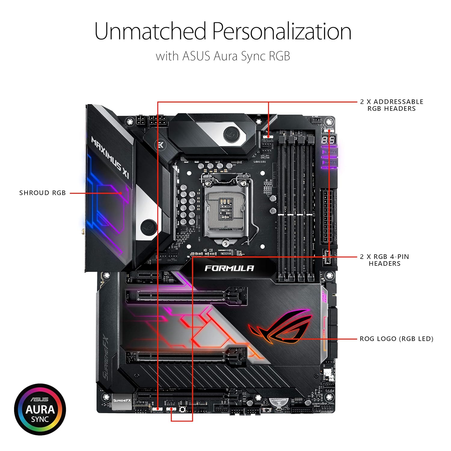 | Included Components | ROG Maximus XI Formula motherboard, User guide, ROG motherboard support DVD, ASUS 2x2 dual band Wi-Fi antenna (Wi-Fi 802.11a/b/g/n/ac compliant), 2-in-1 SATA 6Gb/s cables(2), ROG weave SATA 6G cable, 2-Way SLITM HB bridge, Q-Connector, USB2.0 adapter, extension cable for RGB strips (80cm), extension cable for Addressable LED strips (80cm), M.2 screws package, ROG logo plate sticker, ROG coaster, ROG sticker, ROG Thank you card |