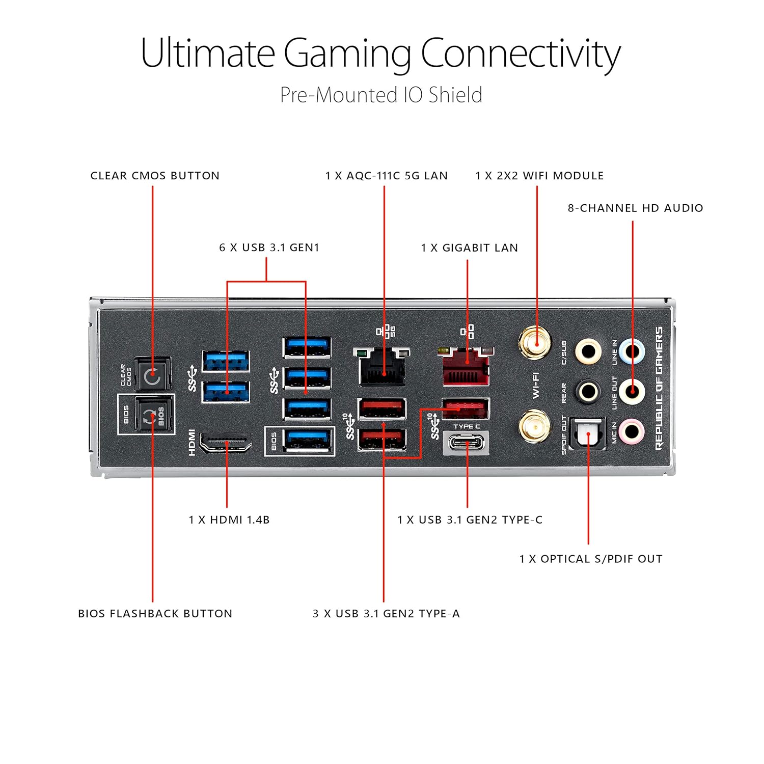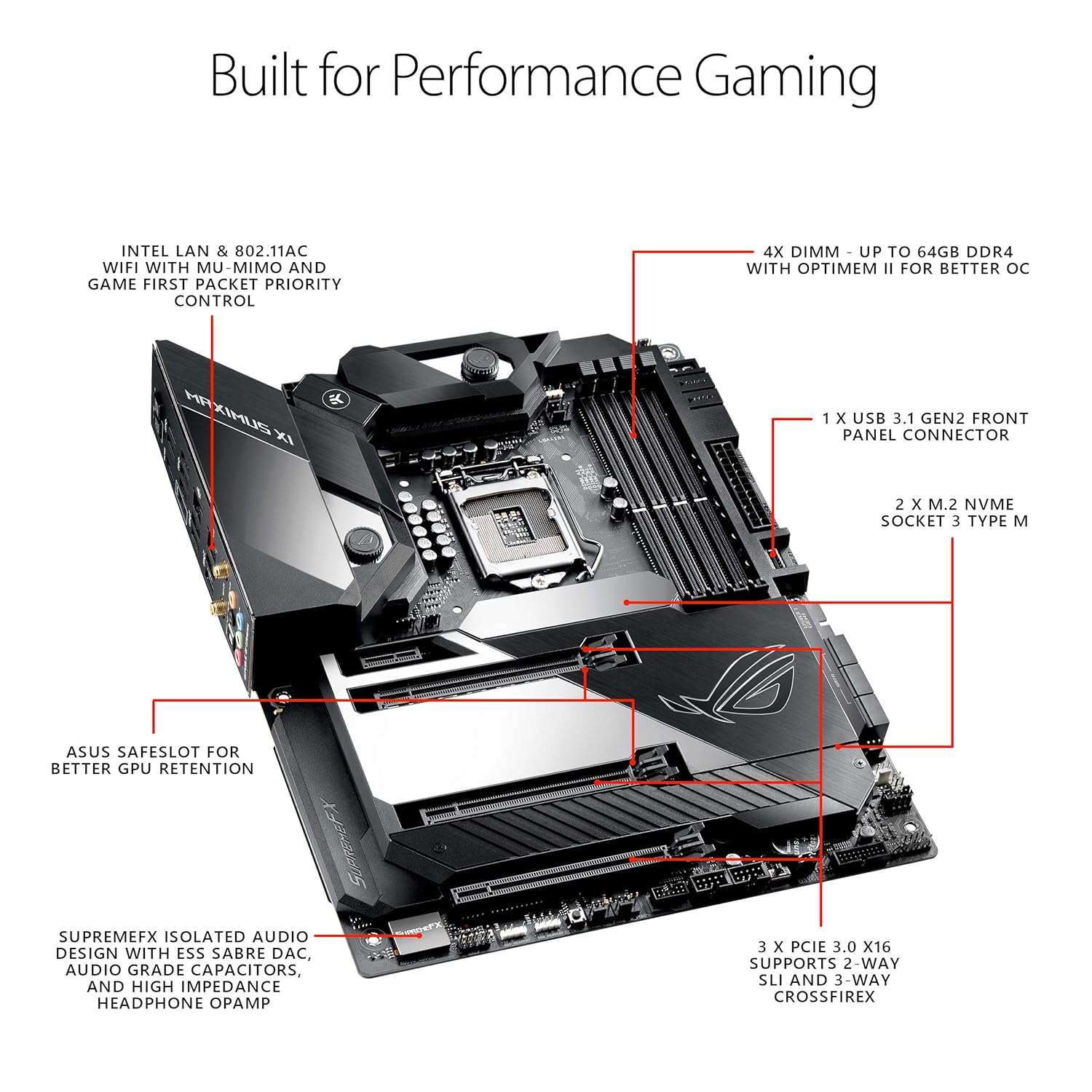 Specifications Mfr Part Number: ROG MAXIMUS XI FORMULA CPU: LGA1151 Supports IntelÃ'Â Core 9000 series, 8th Generation Core i7/ i5/ i3, Pentium and Celeron processors Supports Intel 14nm CPU Supports Intel Turbo Boost Technology 2.0 Chipset: Intel Z390 Memory: 4x DDR4-4400+(OC)/ 4266(OC)/ 4133(OC)/ 4000(OC)/ 3866(OC)/ 3733(OC)/ 3600(OC)/ 3466(OC)/ 3400(OC)/ 3333(OC)/ 3300(OC)/ 3200(OC)/ 3000(OC)/ 2800(OC)/ 2666/ 2400/ 2133 MHz DIMM Slots, Dual Channel, Non-ECC, Unbuffered, Max Capacity of 64GB Slots: 2x PCI-Express 3.0Ã'Â x16 Slots (supports x16, x8/x8, x8/x4+x4), 1x PCI-Express 3.0Ã'Â x16 Slot (runs at x4), 1x PCI-Express 3.0 x1 Slot Multi-Graphics: Supports AMDÃ'Â Quad-GPU/ 3-Way CrossFireX and NVIDIAÃ'Â Ã'Â Quad-GPU/Ã'Â 2-Way SLI Technology Storage: SATA: 6x SATA3 Ports M.2: 2x M.2 Ports (w/ M key), one supports type 2242/ 2260/ 2280/ 22110 & SATA & PCIE 3.0 x4 mode, one supports type 2242/ 2260/ 2280/ 22110 & PCIE 3.0 x4 mode Audio: ROG SupremeFX S1220Ã'Â 8-Channel High Definition Audio CODEC LAN: Intel I219V Gigabit Ethernet Controller, Intel Wireless-AC 9560 2x2 Wi-Fi with MU-MIMO 802.11 a/b/g/n/ac Wireless LAN (2.4/5 GHz), Bluetooth v5.0 Ports: 5x USB 3.1Ã'Â Gen 2 Ports (3 Type-A rear, 1 Type-C rear, 1 front), 10x USB 3.1 Gen 1Ã'Â Ports (6 rear, 4 at mid-board), 8x USB 2.0 Ports (4 rear, 4 at mid-board), 1x HDMI Port, 1x Optical S/PDIF Out, 1x RJ45 LAN Port, 1x 2x2 Wi-Fi module, Audio I/O Jacks Power Connector: 1x 24-pin EATX Power Connector, 1x 8-pin EATX 12V Power Connector, 1x 4-pin EATX 12V Power Connector Form Factor: ATX, 12.0 x 9.6 inch / 30.5 x 24.4 cm |