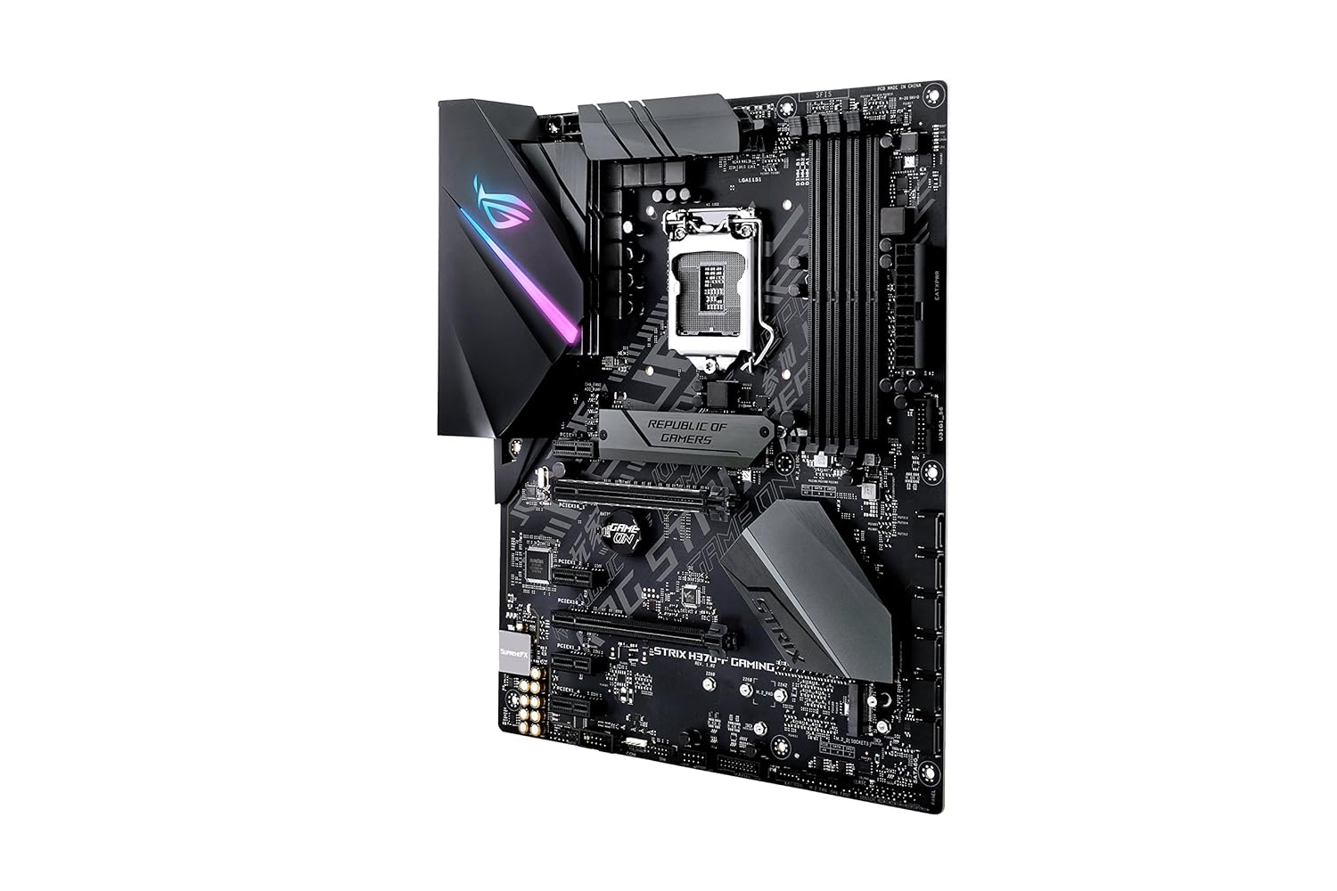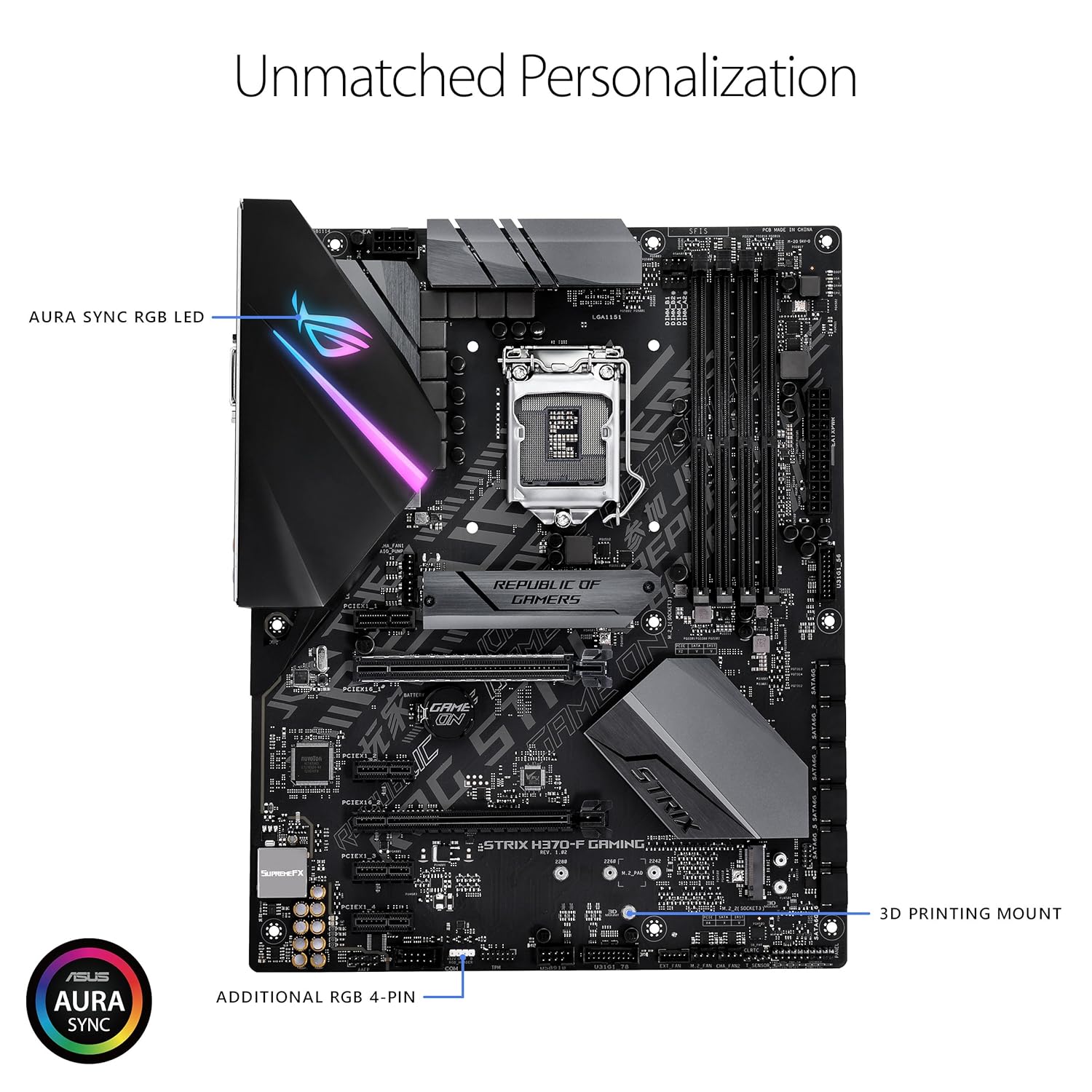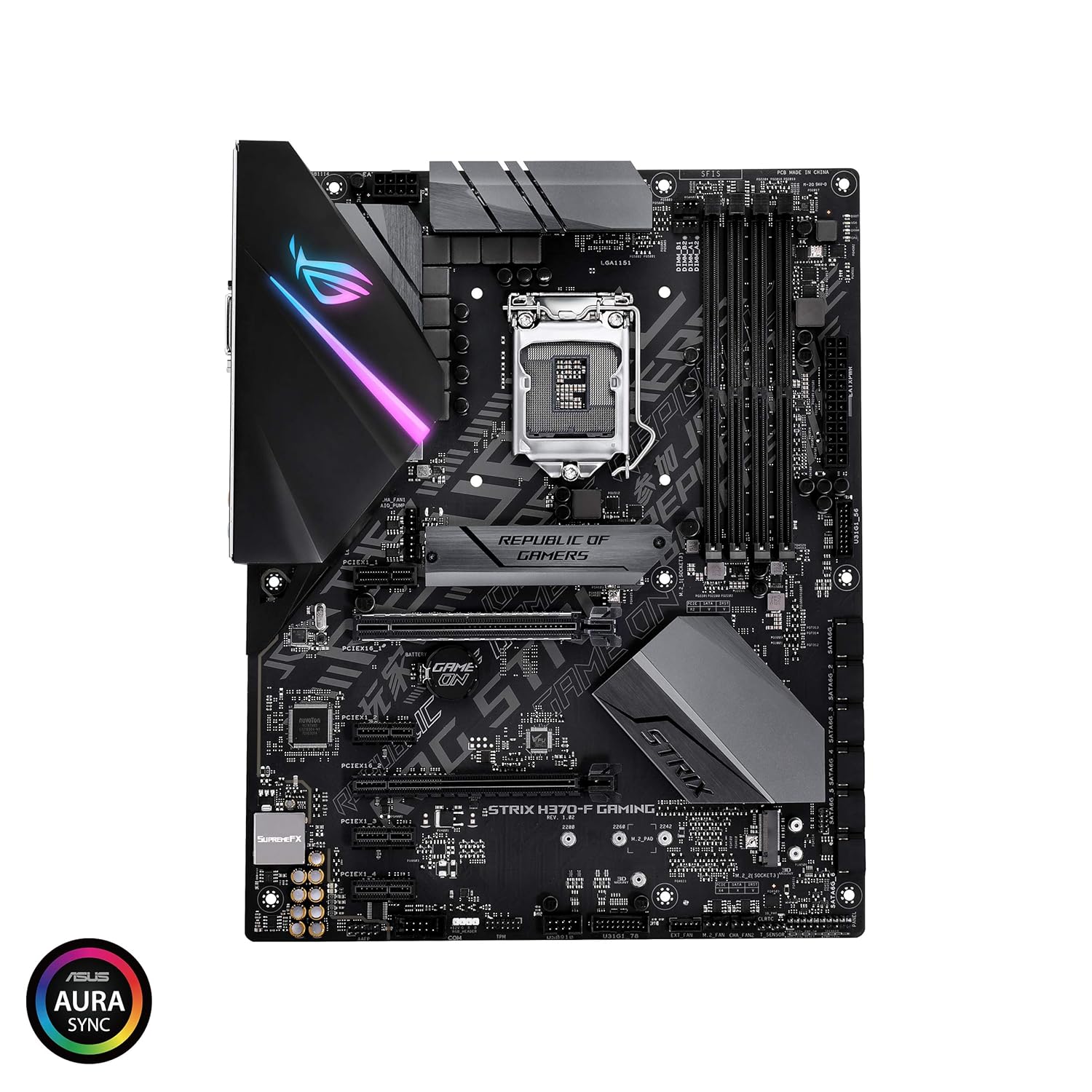 ASUS ROG STRIX H370-F GAMING, Intel H370 ATX gaming motherboard with Aura Sync RGB LED lighting, pre-mounted I/O shield, dual M.2, onboard M.2 heatsink, SATA 6Gbps and USB 3.1 Gen 2. |