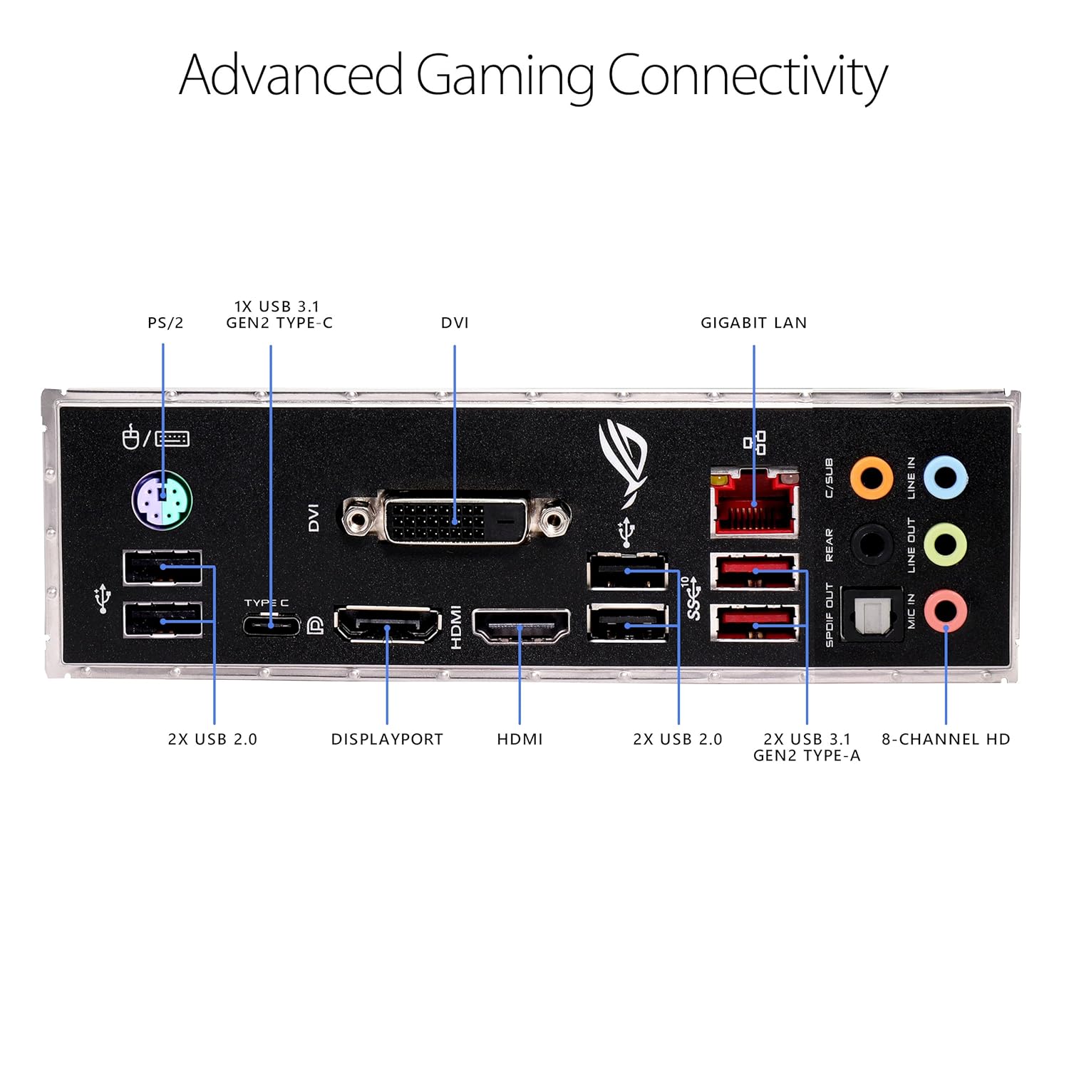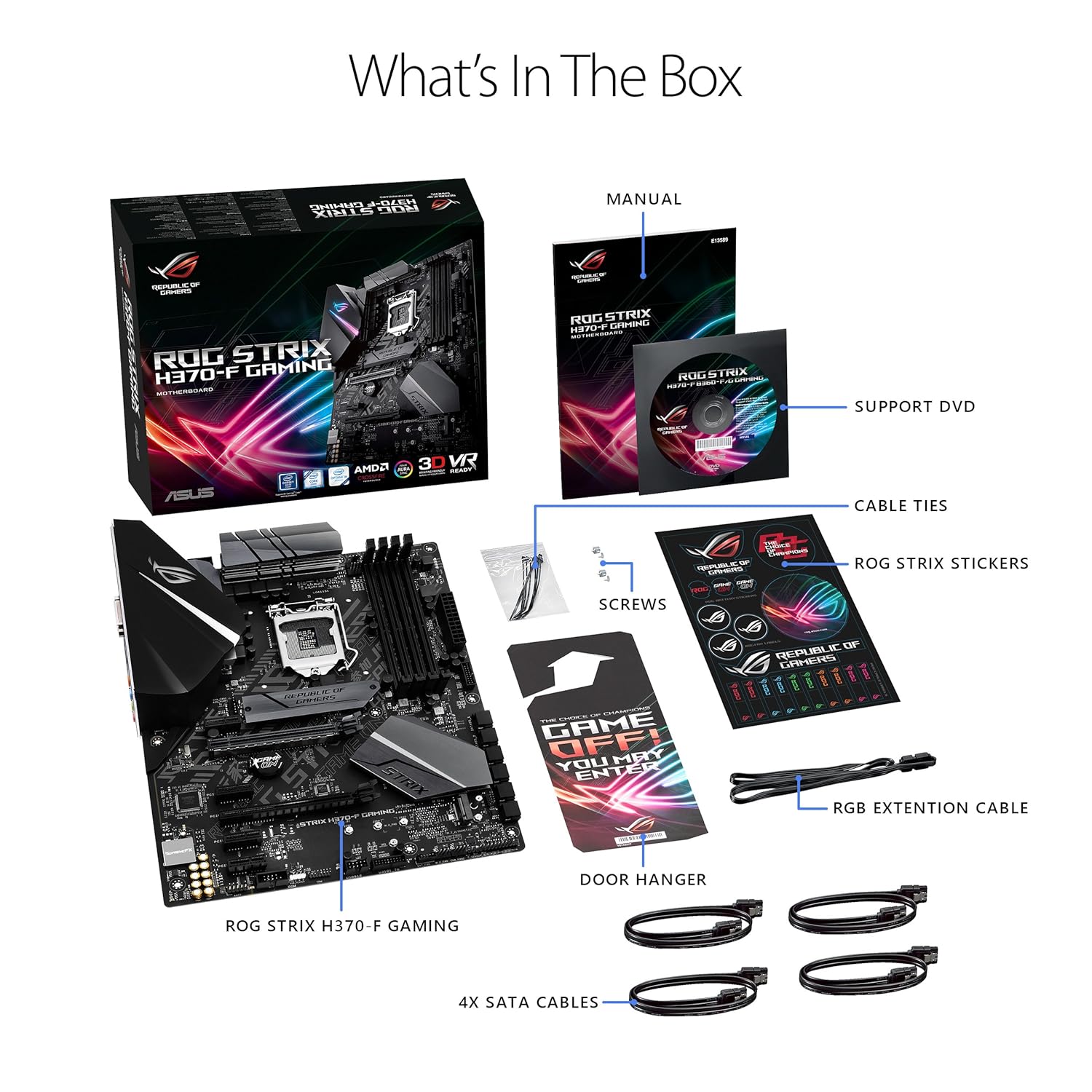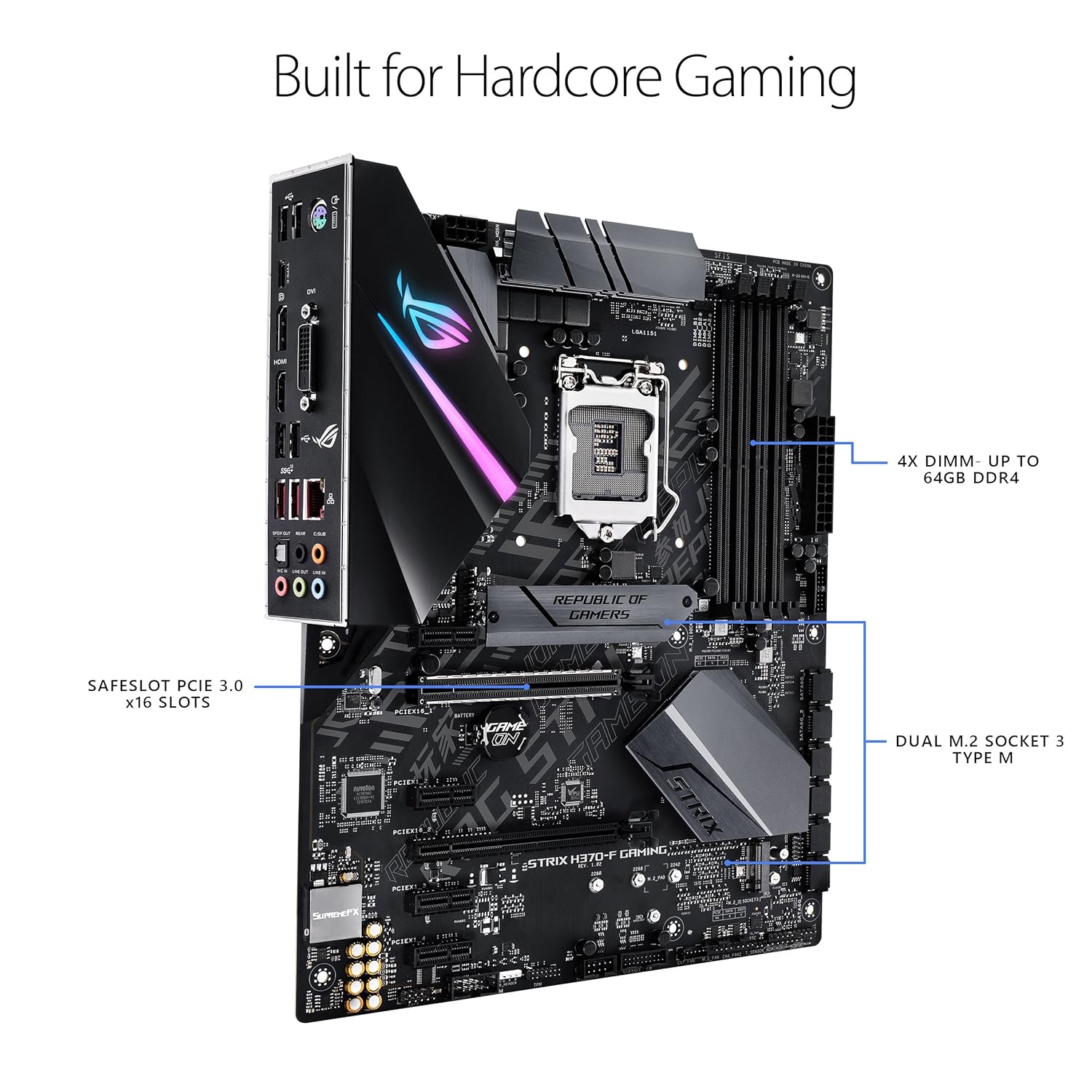 ASUS ROG STRIX H370-F GAMING, Intel H370 ATX gaming motherboard with Aura Sync RGB LED lighting, pre-mounted I/O shield, dual M.2, onboard M.2 heatsink, SATA 6Gbps and USB 3.1 Gen 2. |