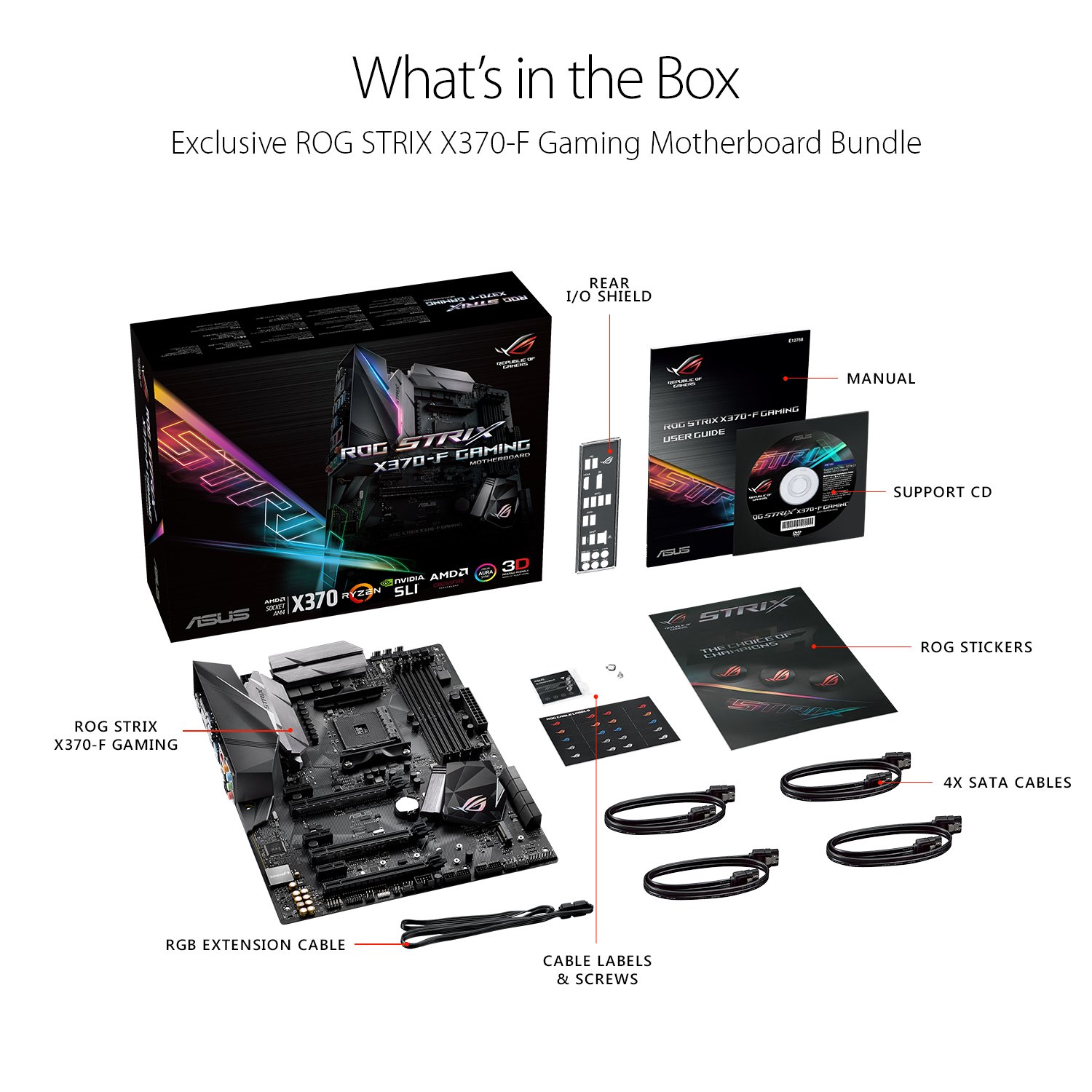 | Included Components | ROG STRIX X370-F GAMING Motherboard, User guide, Support DVD, I/O Shield, SLI HB Bridge(2-way-M), SATA 6Gb/s Cables(4), M.2 Screw package, 3D Printing Mount, RGB LED extension cable, 10-in-1 ROG cable label, ROG Strix sticker, cable tie package |