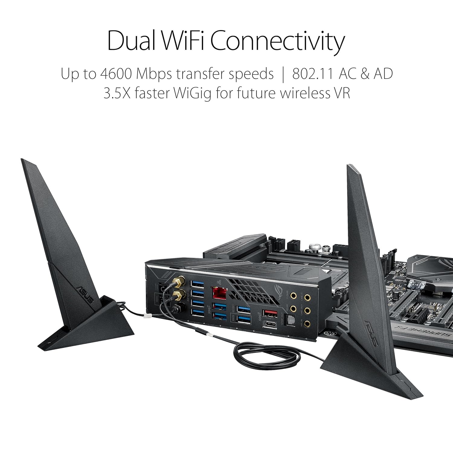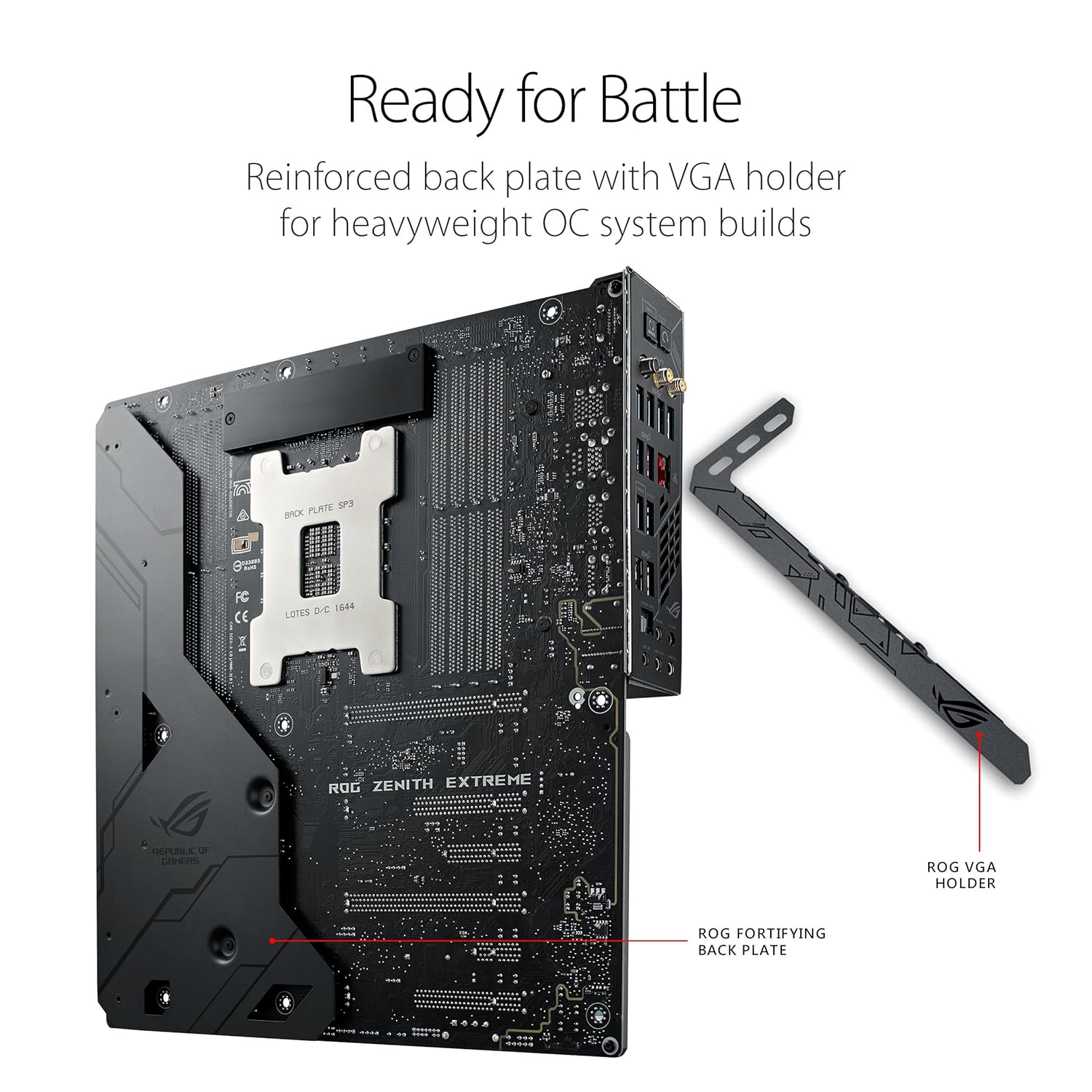 | Included Components | ROG ZENITH EXTREME Motherbaord, 3-in-1 thermistor cable, 2-in-1 SATA 6Gb/s Cables(3), Q-Connector Kit, ROG Coaster, 10-in-1 ROG cable label, ROG big sticker, RGB LED extension cable, RGB Addressable LED extension cable, ROG VGA holder, Wafer cable, ASUS 1T1R dual band Wi-Fi moving antenna (Wi-Fi 802.11ad compliant), ASUS 2T2R dual band Wi-Fi moving antenna (Wi-Fi 802.11a/b/g/n/ac compliant) |