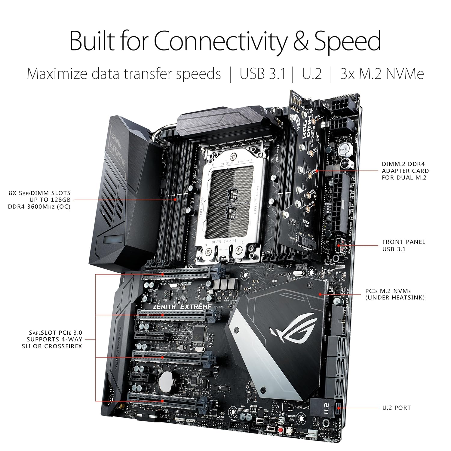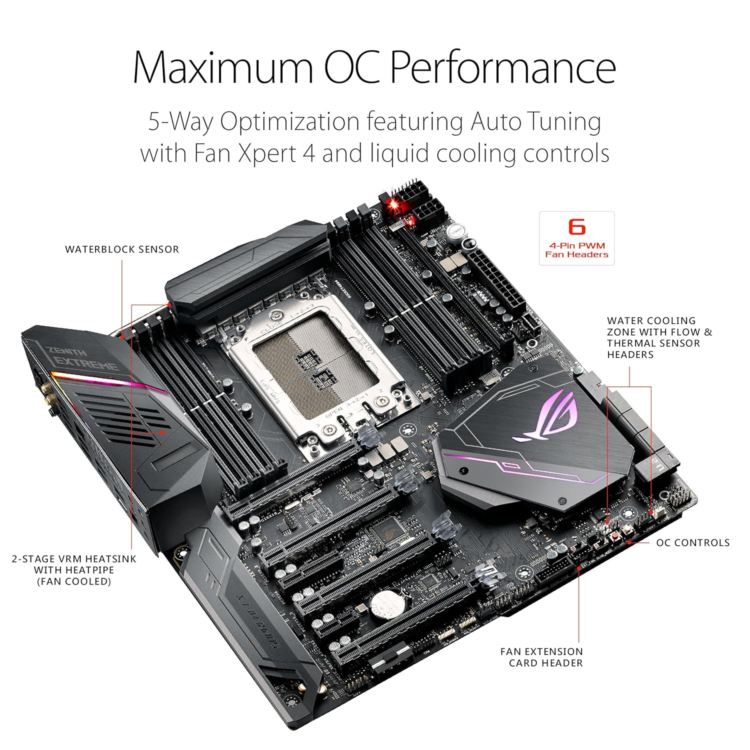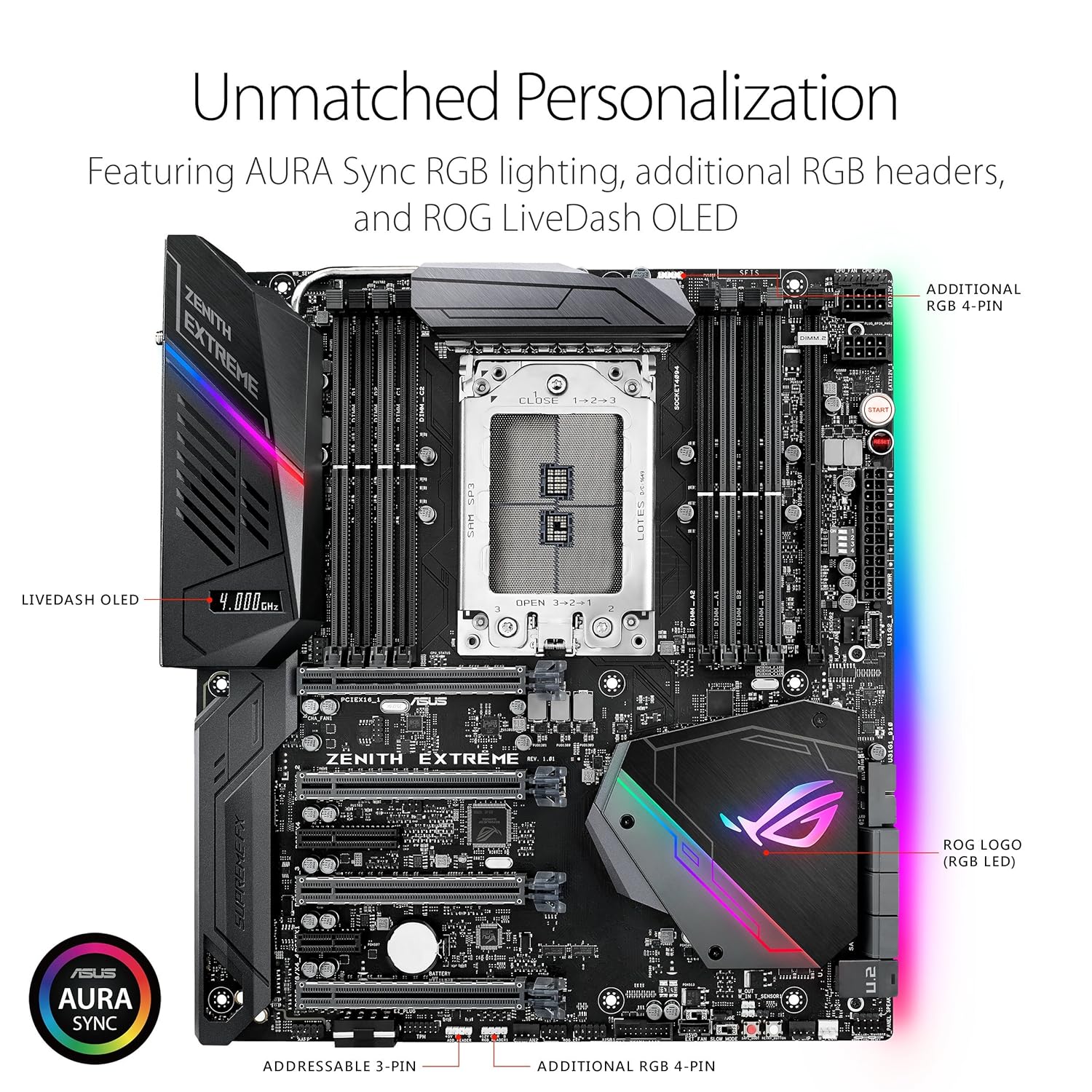 Powered by AMD Ryzen Threadripper, the ROG Zenith Extreme delivers performance with gaming-centric features like 5-Way Optimization for advanced overclocking and fully immersive sound with SupremeFx, Sonic Studio, and Sonic Radar. Innovative vertically mounted M.2 drives via DIMM.2 provide optimized cooling while AURA Sync RGB lighting offers unlimited personalization. |