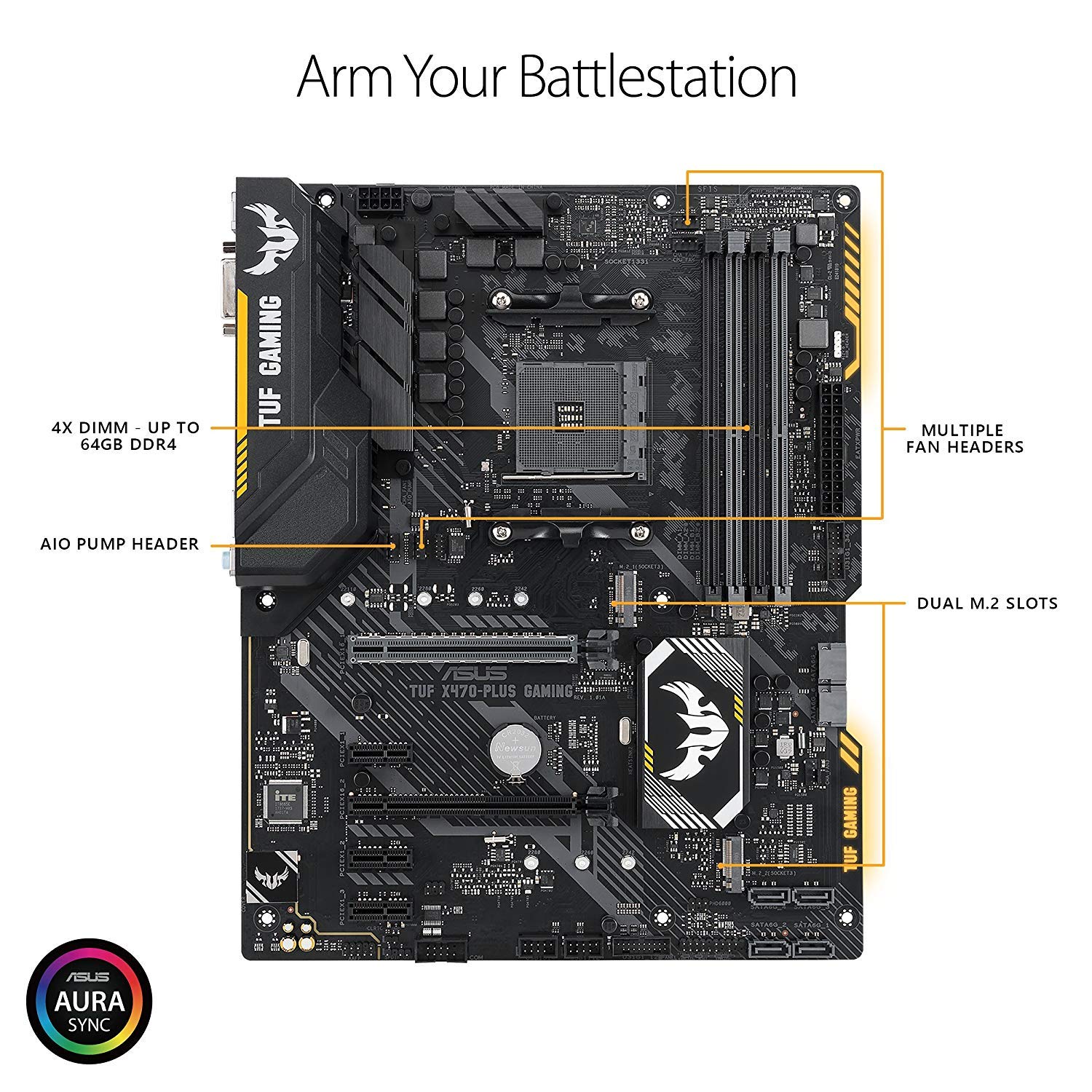 Powered by AMD Ryzen 2 AM4 processors, the ASUS TUF X470-Plus Gaming delivers 24/7 performance. Unlock your system's full potential with Gamer's Guardian featuring SafeSlot and Fan Xpert 4 Core while personalizing your build with Aura Sync lighting. Integrated dual M.2, gigabit LAN and USB 3.1 Gen2 deliver maximum connectivity speeds. |