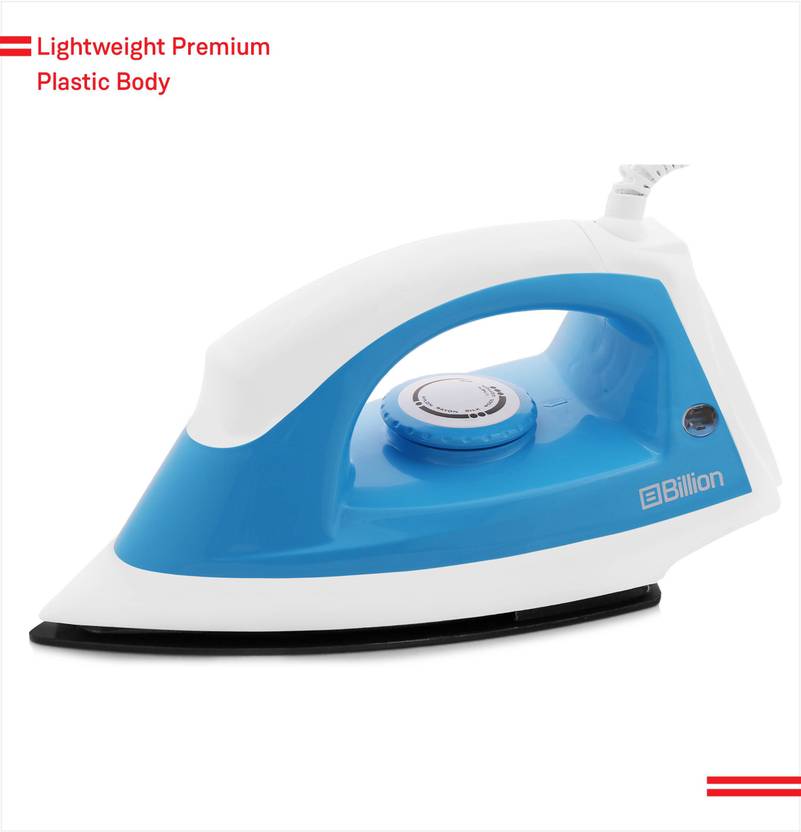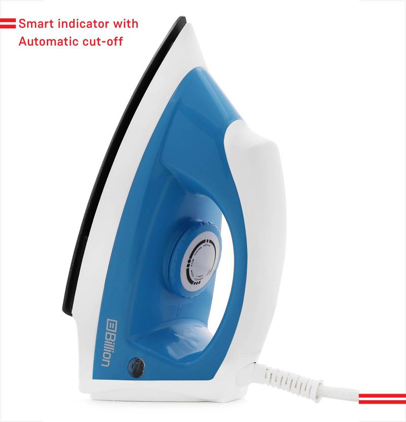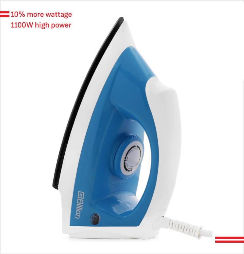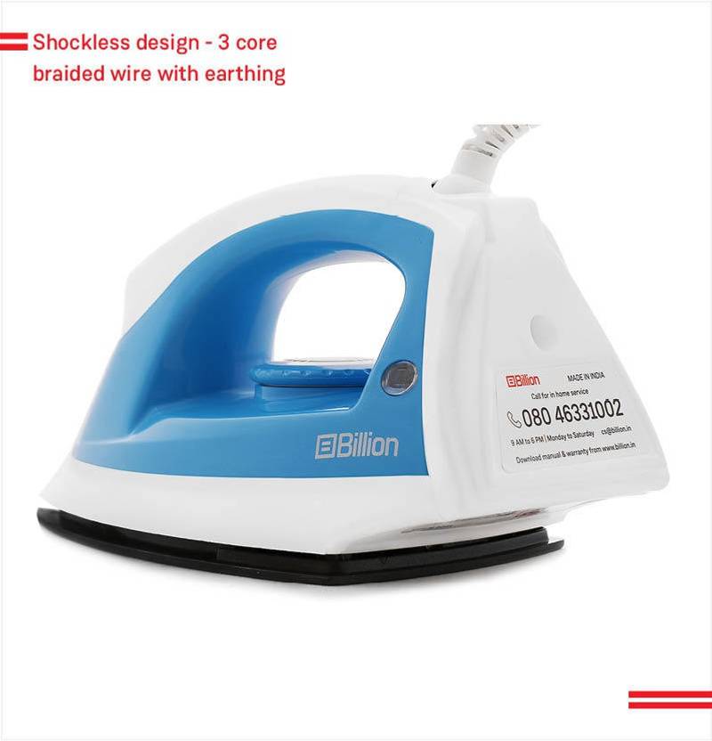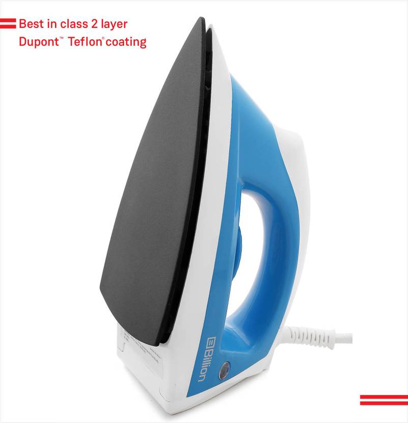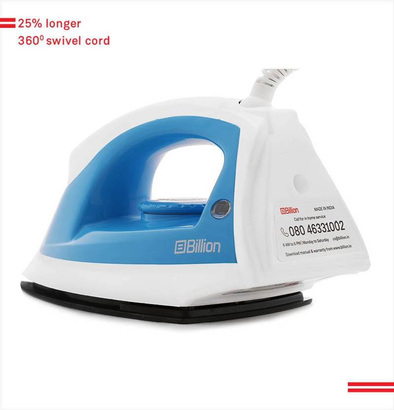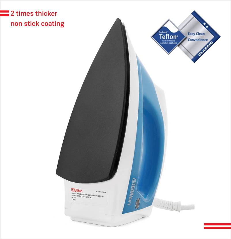 "Indians, arguably, have the most varied collection of outfits. This 1100 W Non-stick, extra power XR112 Dry Iron from Billion, a Flipkart brand, with its Teflon coating, is truly made for India. Smooth Gliding The two-layered nonstick Dupont Teflon classic coating ensures the iron doesn't stick to your clothes and glides on them smoothly, even on silk-like fabrics. Fast Crease Removal Since this dry iron has 10% higher wattage than conventional irons (1100 W), it removes fine creases effectively in no time. 360-degree Swivel Cord The 1.9-meter-long cord of this dry iron is up to 25% longer than regular irons. The three-core, cotton-braided textured swivel cord offers you 360-degree free movement. It helps in moving the iron effortlessly, preventing tangles and keeping your wrists stress free. Easy-to-use Design The cool-touch, lightweight body helps you iron with less effort, yet it is heavy enough to take out the tough wrinkles from cotton clothes and denims. The body of this iron is made of high-quality plastic and comes in a premium, dual color design. Smart Heat Regulator Knob The regulator of this iron comes with a cloth indicator that helps you select a temperature as per the fabric of your clothes. Shockless design The Iron body has 3 core connections with earthing which ensure that you are protected against any electric shock-related accidents."