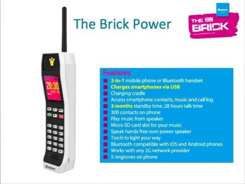 Product Description The Brick mobile phone from Binatone Introducing The Brick: the biggest mobile phone you ever had, or the biggest Bluetooth handset you will ever have. Retro 1980s cool doesn't come any more iconic than The Brick, a phone as big as the attitude that used to come with it! The story of The Brick, the ultimate accessory The Brick with 80s fancy dress The Brick is the ultimate 80s-themed accessory for fancy dress or parties! Phones are getting smarter, thinner, smaller. They all look the same. Battery performance gets worse every year. Is talking on the phone still fun? The Brick is simple, bulky, comfy. It will turn heads at every party, and its juice will last for months. Taking inspiration from the early days of mobile phones, The Brick from Binatone was created as the first retro mobile ever. Made famous by Gordon Gekko in 1987's Wall Street and once only affordable to flash city boys, now anyone can afford this fabulous slice of fun nostalgia! The Brick may be amusing but Binatone has still taken it seriously when it comes to getting all the little details right. From the sturdy keys with sound effects to the bling logo on the back, it certainly looks the part. The perfect phone for clamping against your shoulder The style may look back years but the technology is bang up to date, including the option of either putting your SIM card directly into The Brick or using it to make and take calls from your regular smartphone via Bluetooth. The battery gives you an impressive 14 hours of talk time (and nearly a whole month on standby), while you can use the 1.8-inch colour screen with 128 x 160 resolution to scroll through your contacts or enjoy a nostalgic game of Snake.