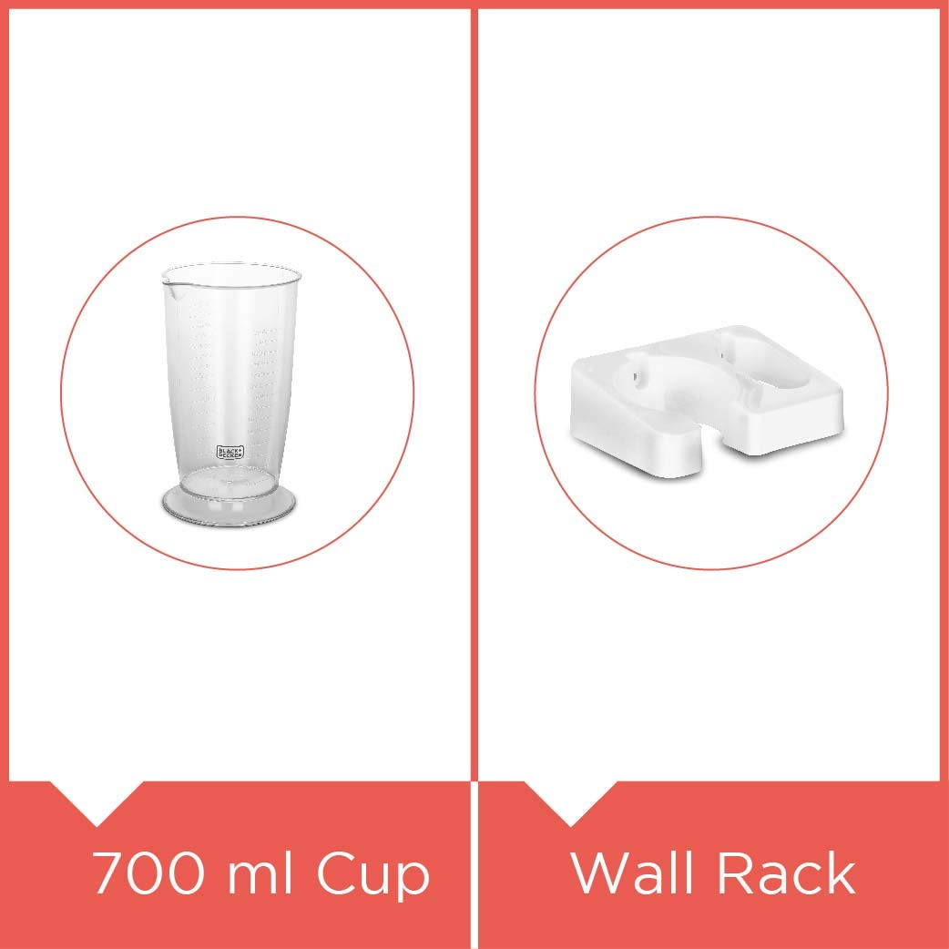 Includes: Hand blender, instruction manual, chopper, whisk, cup and wall rack