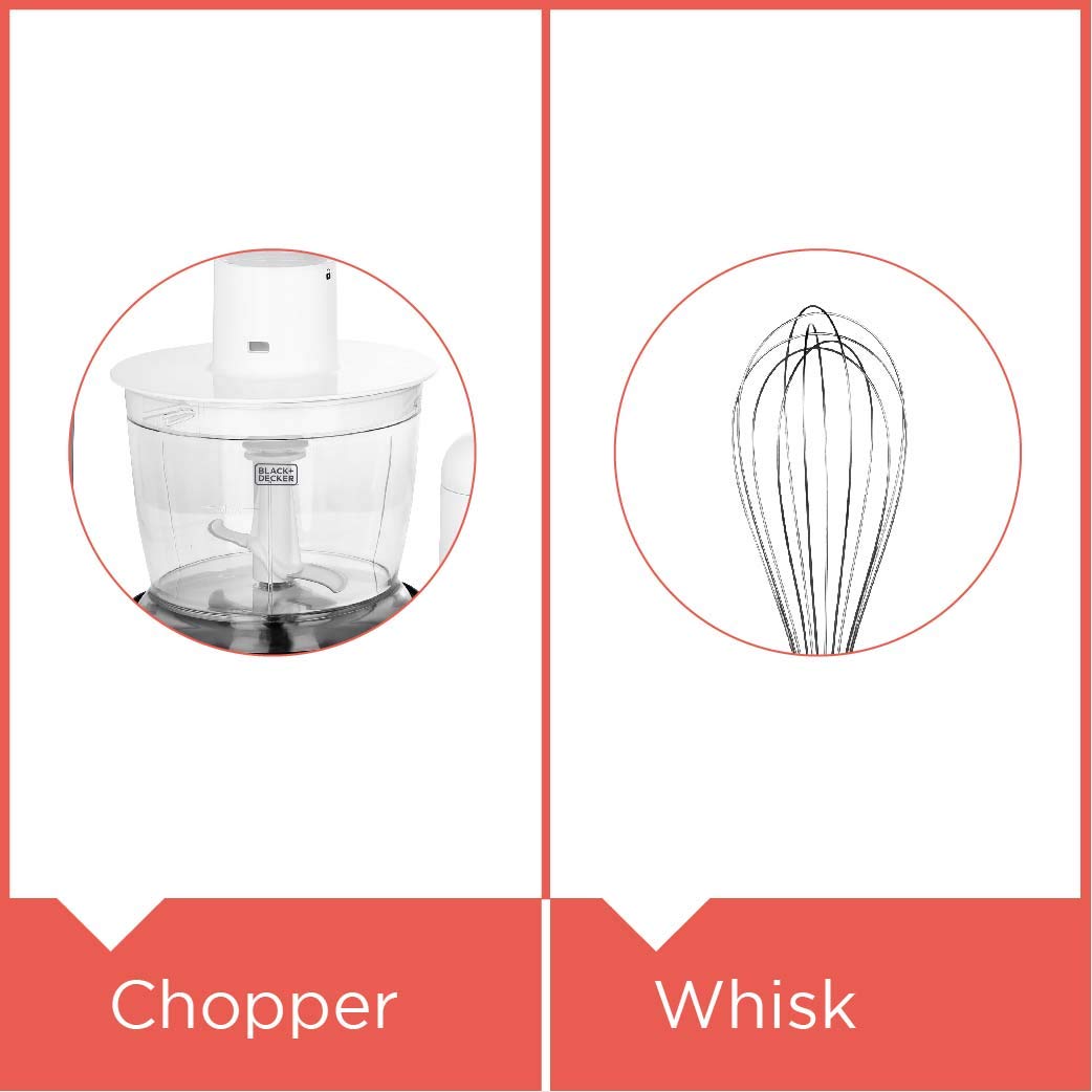 Attachments: Chopper, whisk, wall rack and beaker