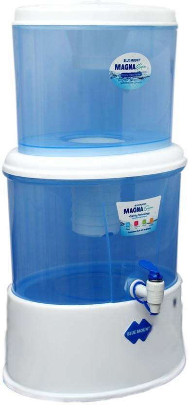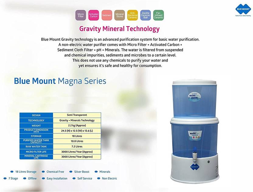 Blue Mount Gravity technology is an advanced purification system for basic water purification. A non-electric water purifier comes with Ceramic Filter + Activated Carbon + Sediment Cloth Filter + pH + Minerals. The water is filtered from suspended and chemical impurities, sediments and microbes to a certain level. This does not use any chemicals to purify your water and yet ensures it's safe and healthy for consumption.