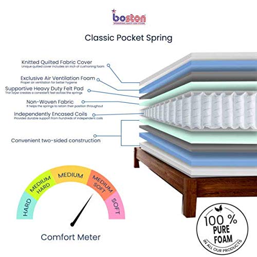 Knitted Quilted Fabric: A Unique Quilted Cover Includes An Inch Of Cushioning Foam | Exclusive Air Ventilation Technology: Proper Air Ventilation For Better Hygiene | 100% Pure: 100% Pure Sleep Grade Foam | Zero Disturbance Technology: Minimizes Motion Transfer From Tossing And Turning Of Partner | Pocket Spring: Provides Durable Support From Hundreds Of Independently Coil