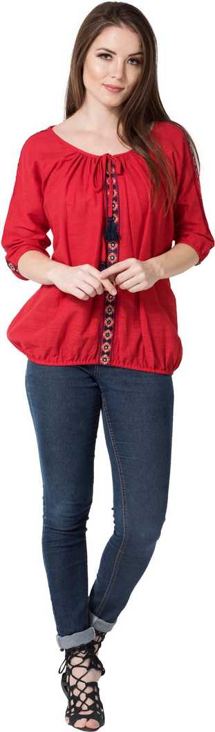 Cotton Slub Red Embroidered Top Length 26 Inches |