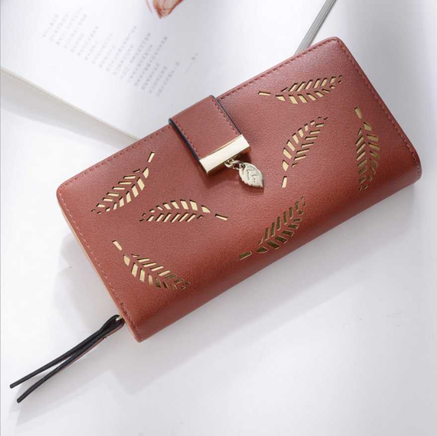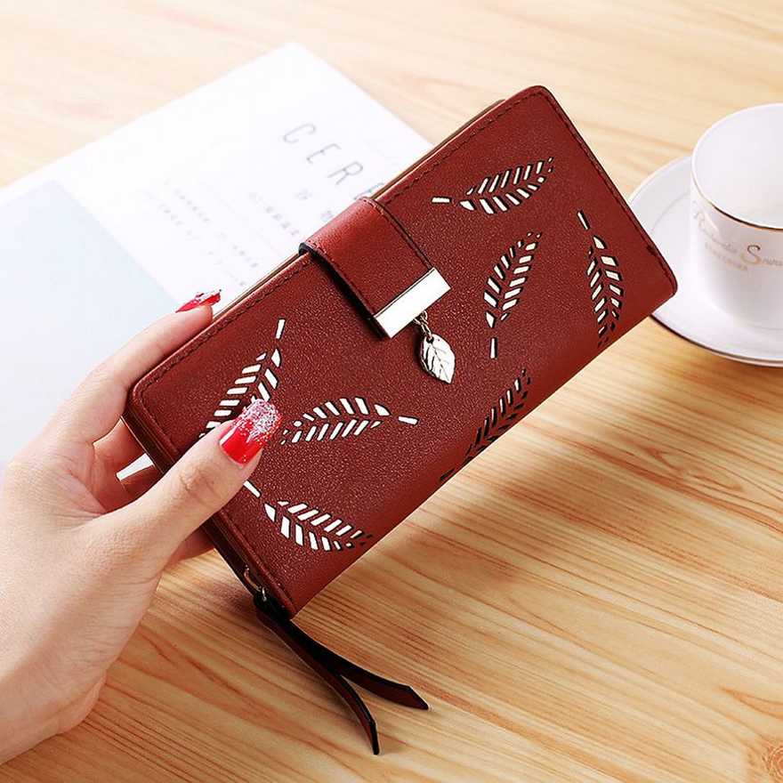 Model Name: Women's Long Leaf Pattern Bifold Card Holder Purse Zipper Buckle Elegant Clutch Wallet