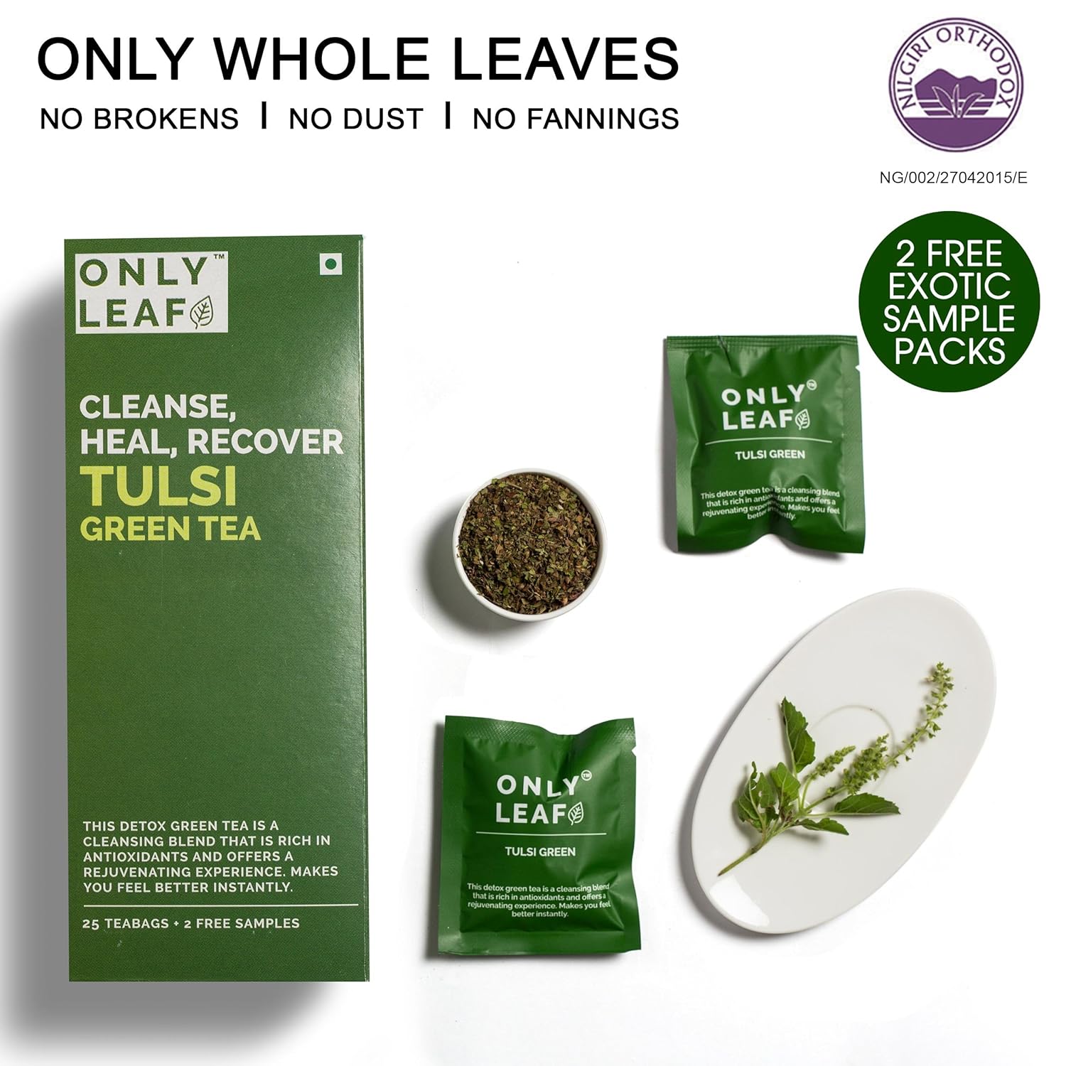 Onlyleaf Tulsi Green Tea, 25 Tea Bags with 2 Free Exotic Samples