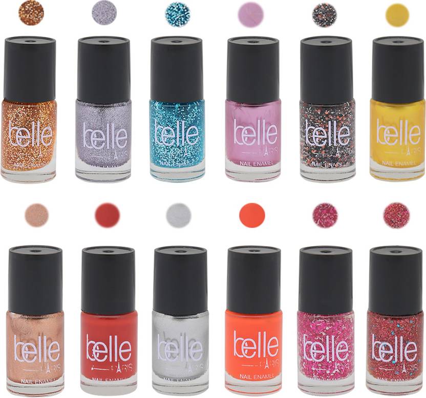 BELLE Set of 12 Nail Enamel Glossy , Glitter and Metallic 5 ml each MultiCo...