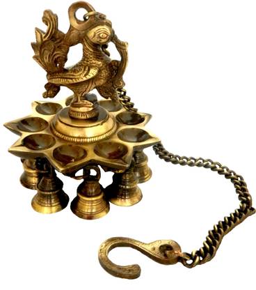 Brass Collection Brass Peacock Deepak With Bells and Chain Brass Hanging Di...