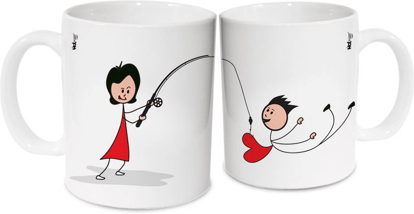 Hot Muggs U&Me - Fishing my heart Ceramic Mug (350 ml, Pack of 2)