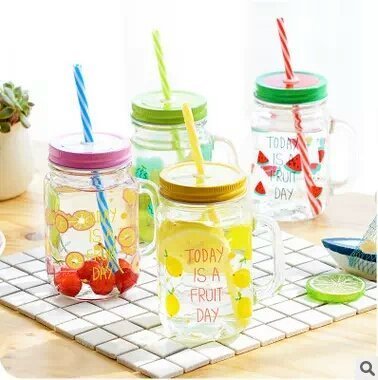 orchid Fruit Design Mason Jars with Handle and Straw, 450 ml, Multicolour -...