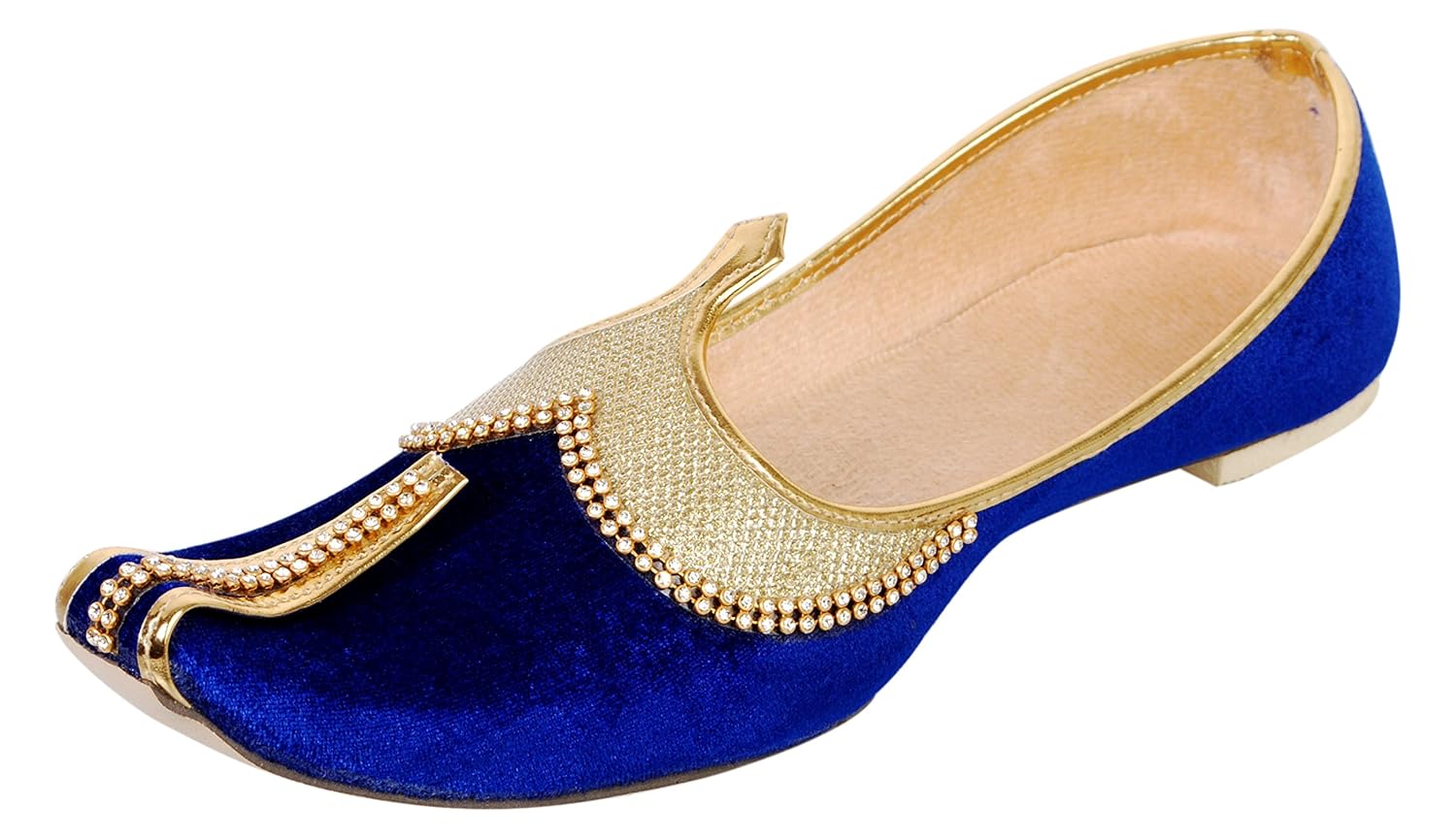 vision art JOPELLE Men's Blue Golden Velvet Sherwani Mojaris (Jutti)