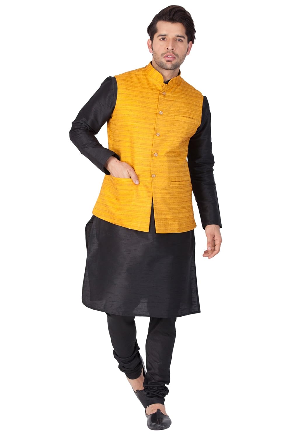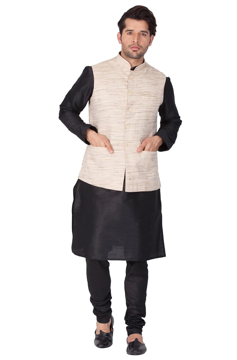 Vastramay Men Cotton Silk Kurta Modi Jacket and Pyjama Set (Black_VASMJ002Y...