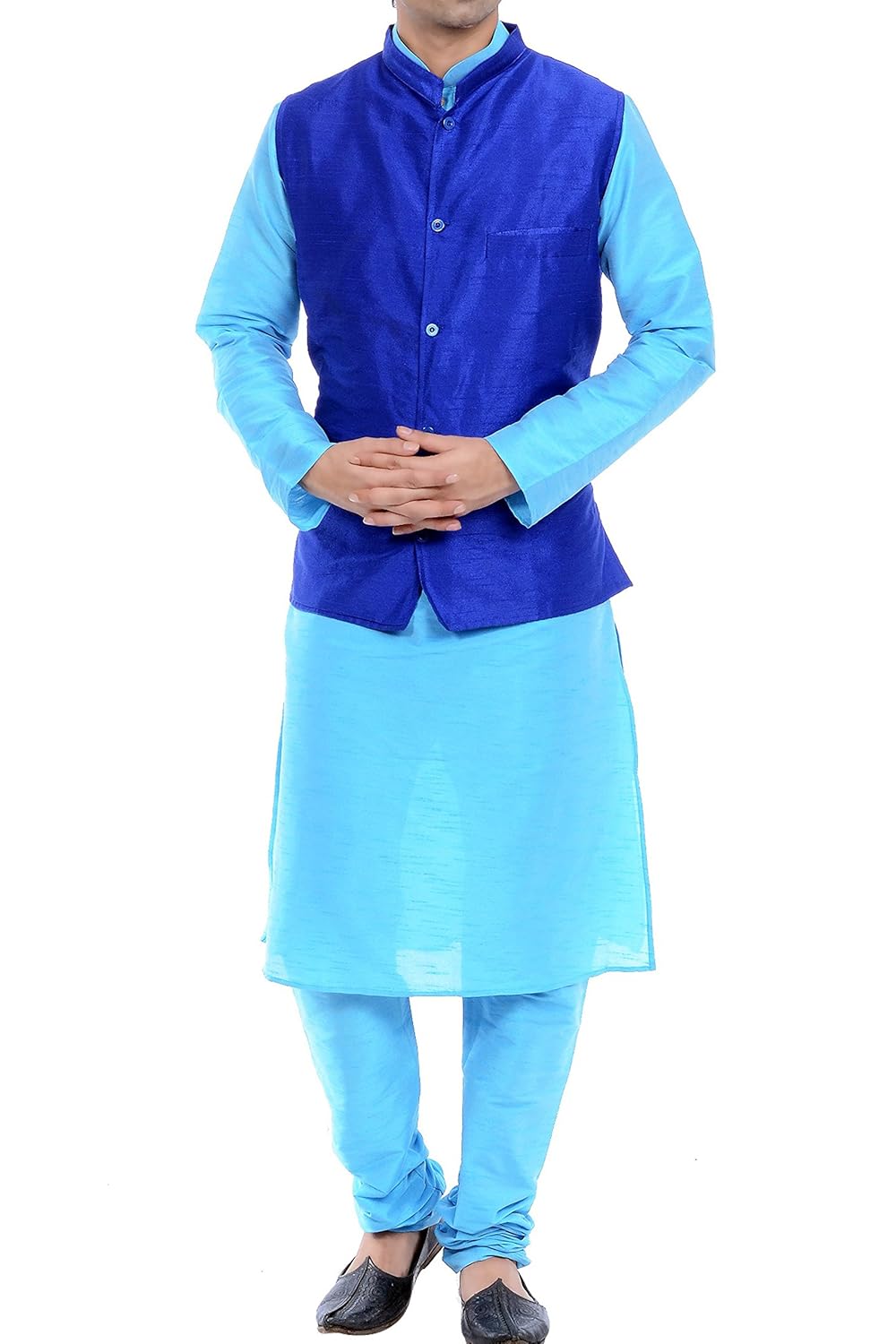 Vastramay Men's Cotton Silk Kurta, Pyjama & Waistcoat Set (Color: Blue & Aq...