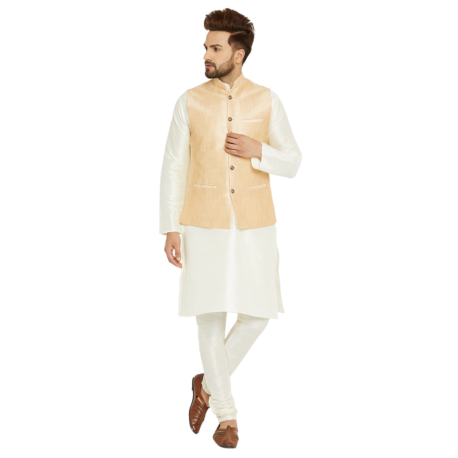 Sojanya (Since 1958), Men's Cream and Gold Silk Blend Kurta Pyjama & Nehru ...