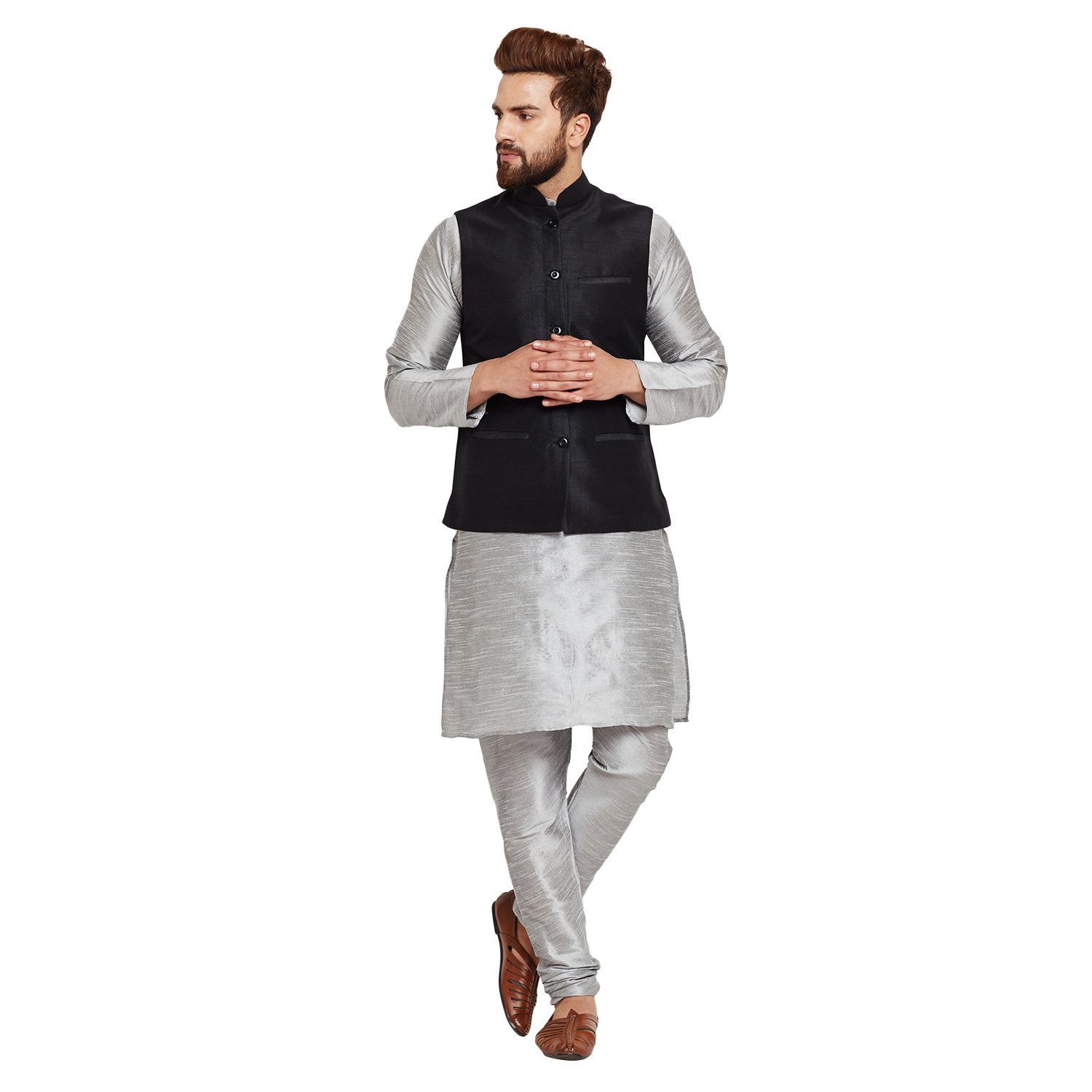 Sojanya (Since 1958), Men's Grey and Black Silk Blend Kurta Pyjama & Nehru ...