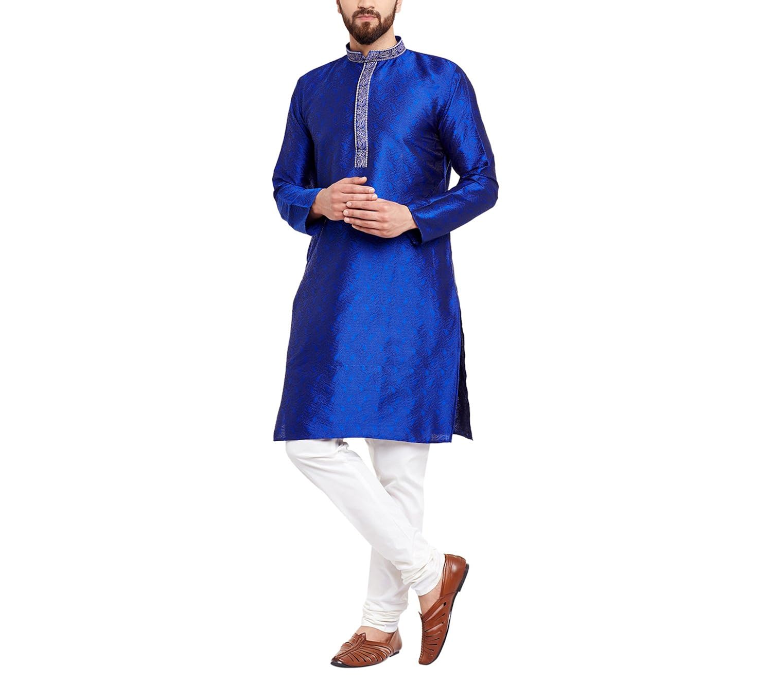 Sojanya (Since 1958) Men's Royal Blue Jacquard Silk Kurta & Churidaar Pyjam...