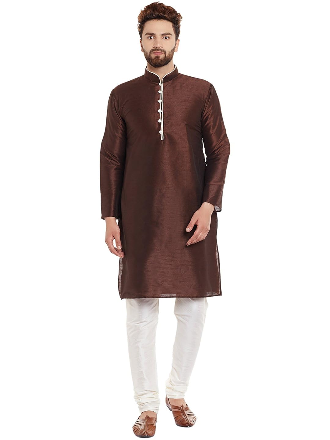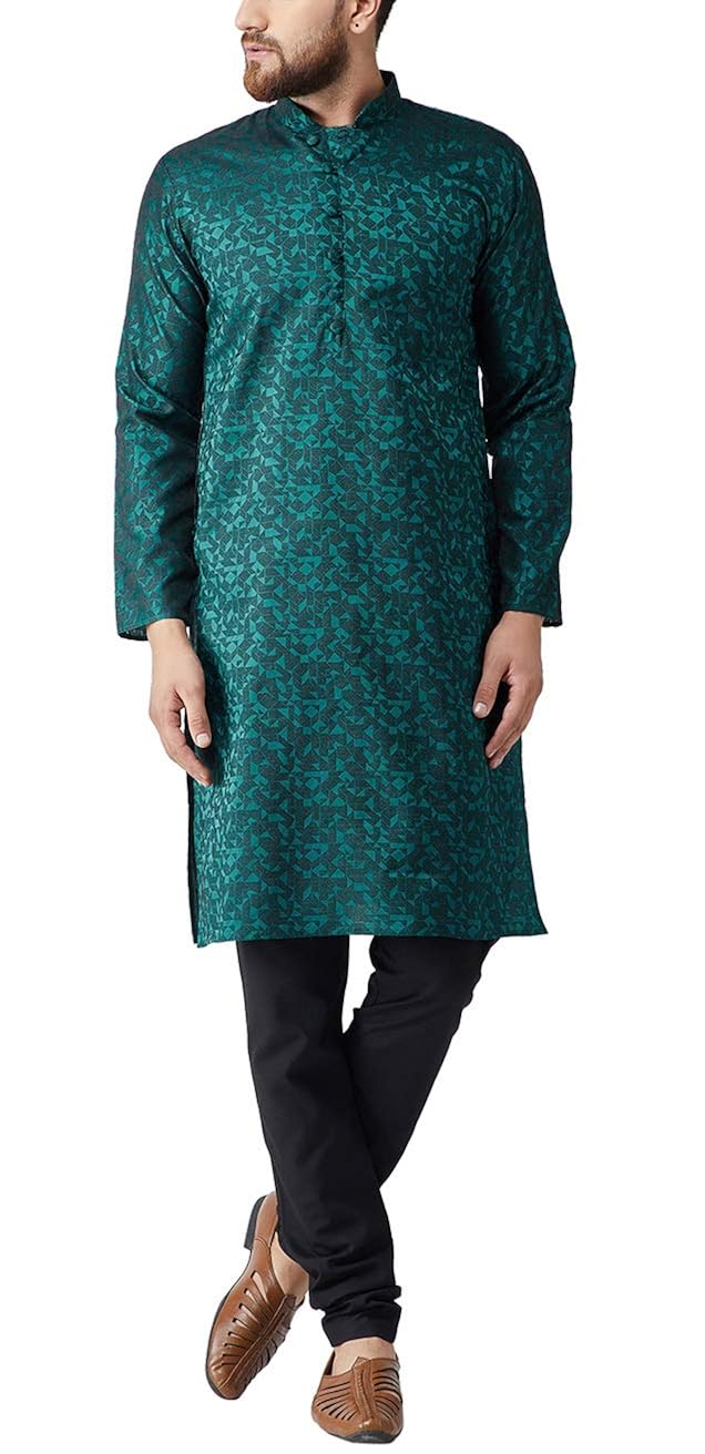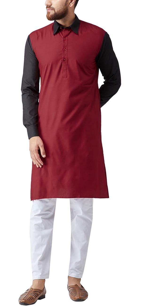 Sojanya (Since 1958) Mens Maroon Jacquard Silk Kurta and Black Churidaar Py...