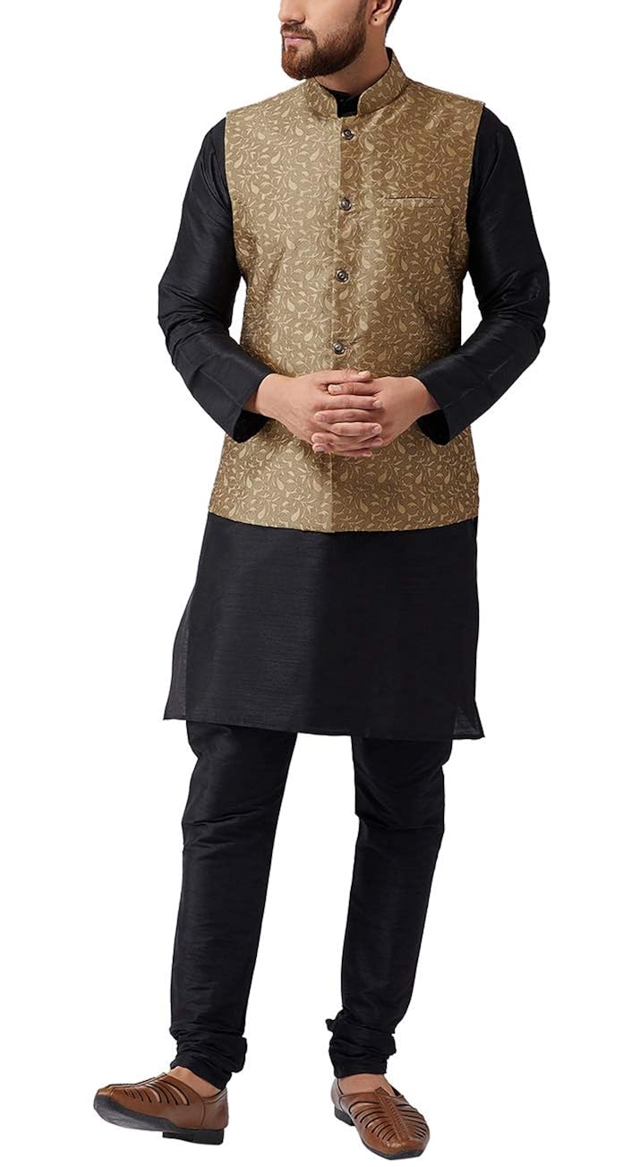 Sojanya (Since 1958), Mens Silk Blend Black Kurta Pyjama & Nehru Jacket COM...