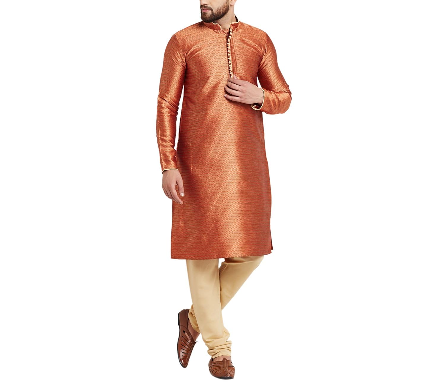Sojanya (Since 1958) Men's Men's Rust Orange Fancy Jacquard Silk Kurta & Ch...