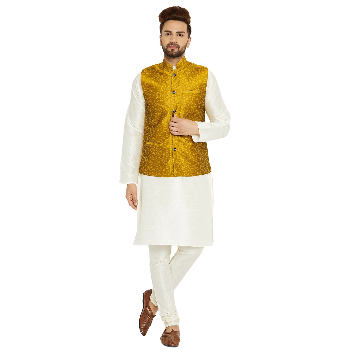 Sojanya (Since 1958), Men's Cream Silk Kurta Pyjama and Mustard Nehru Jacke...