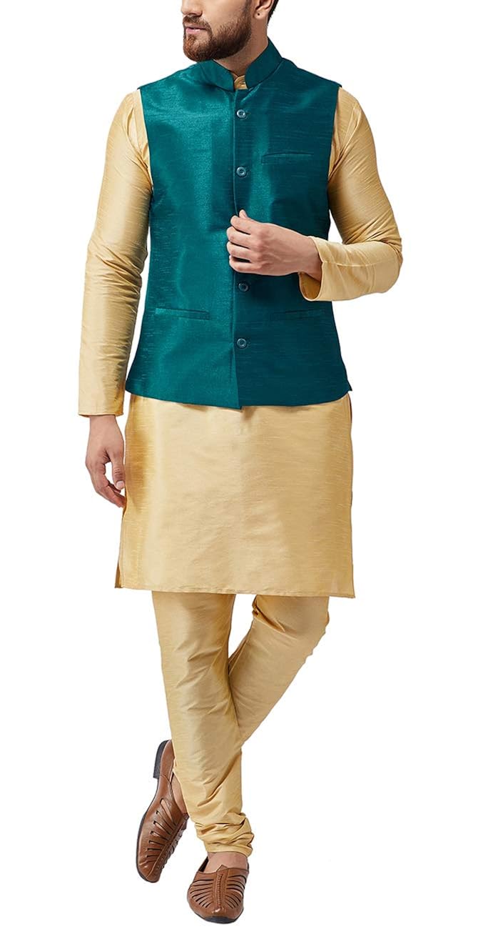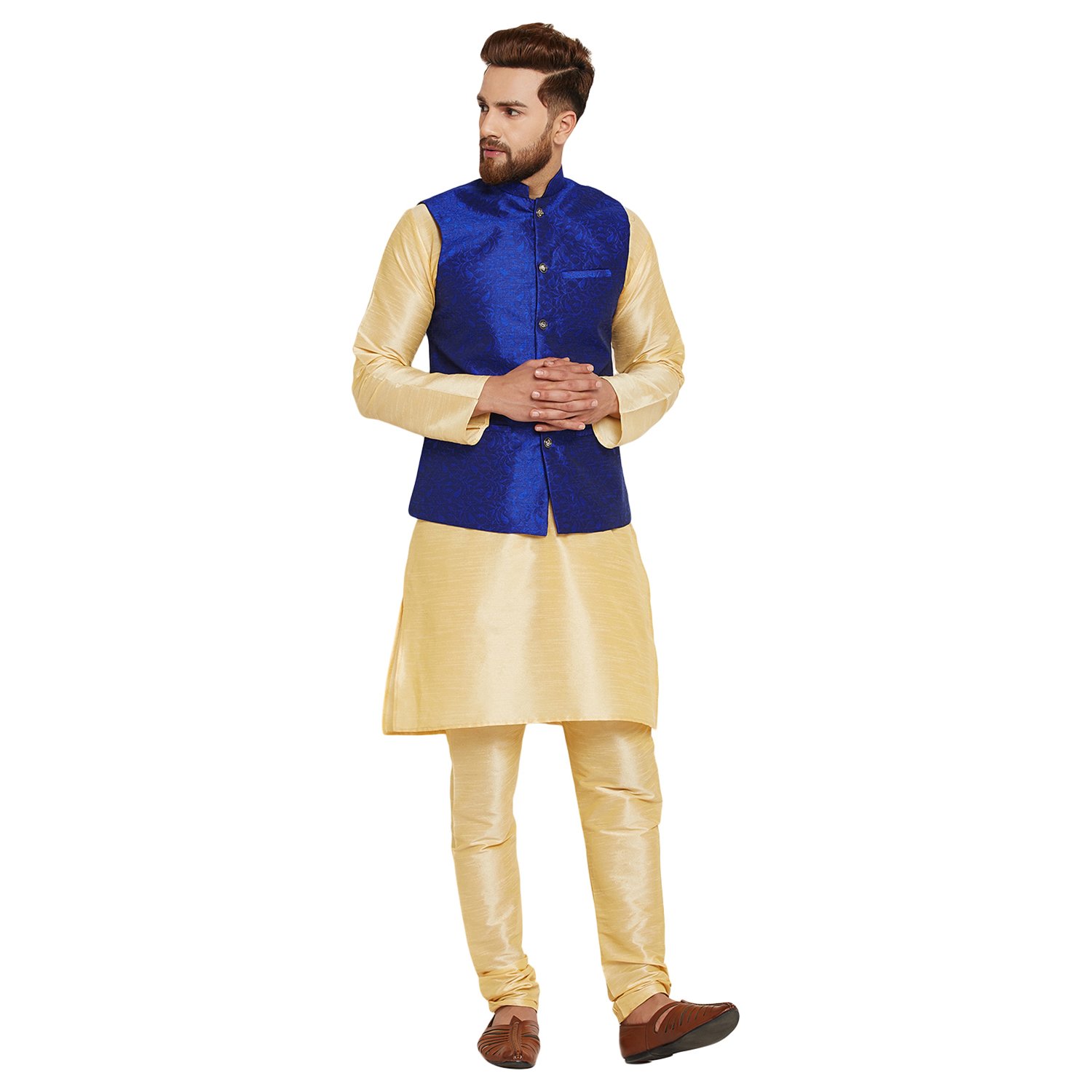 Sojanya (Since 1958), Men's Gold and Blue Silk Blend Kurta Pyjama & Nehru J...