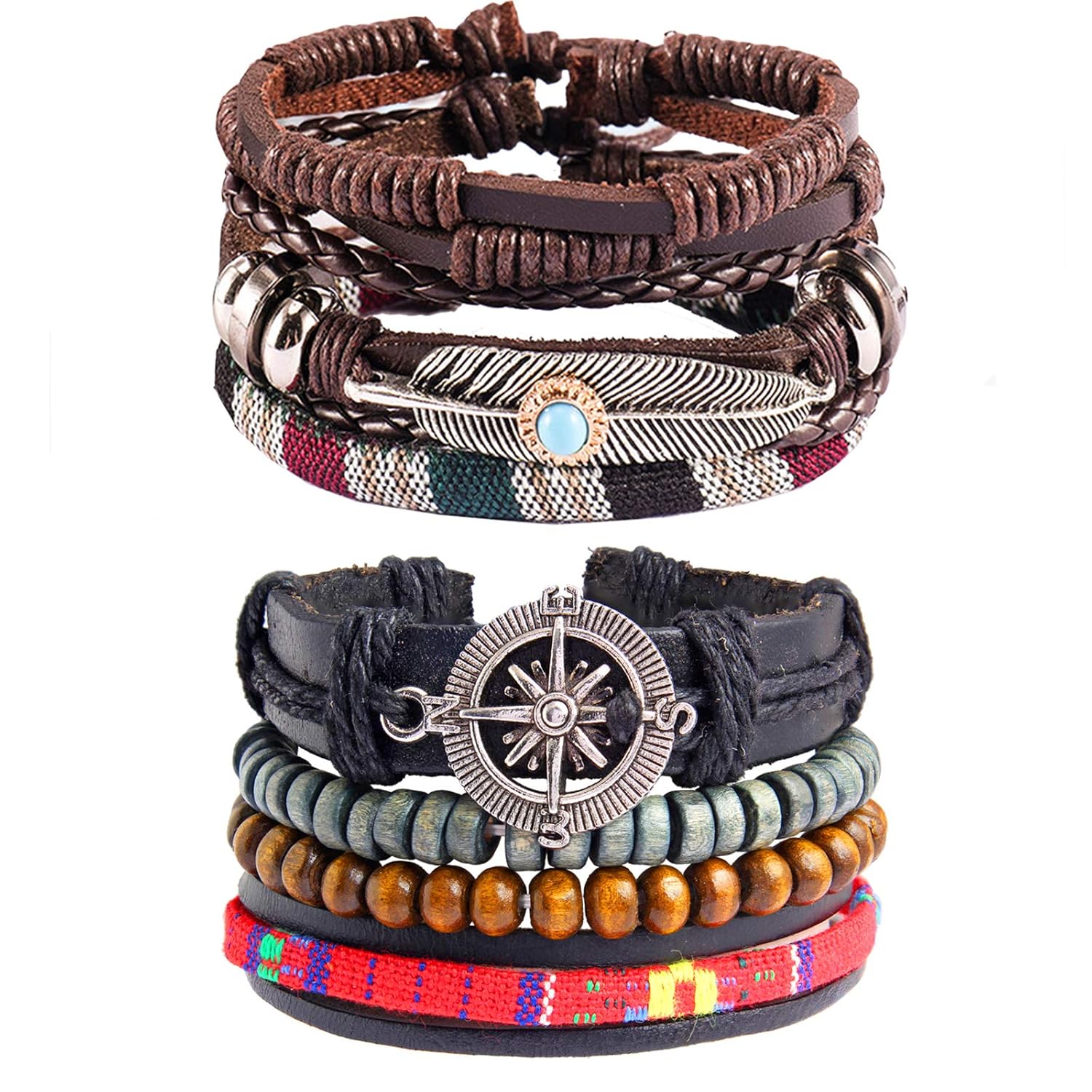 ZIVOM Leather Feather Charm Handcrafted Wood Tibetan Stackable Multistrand ...