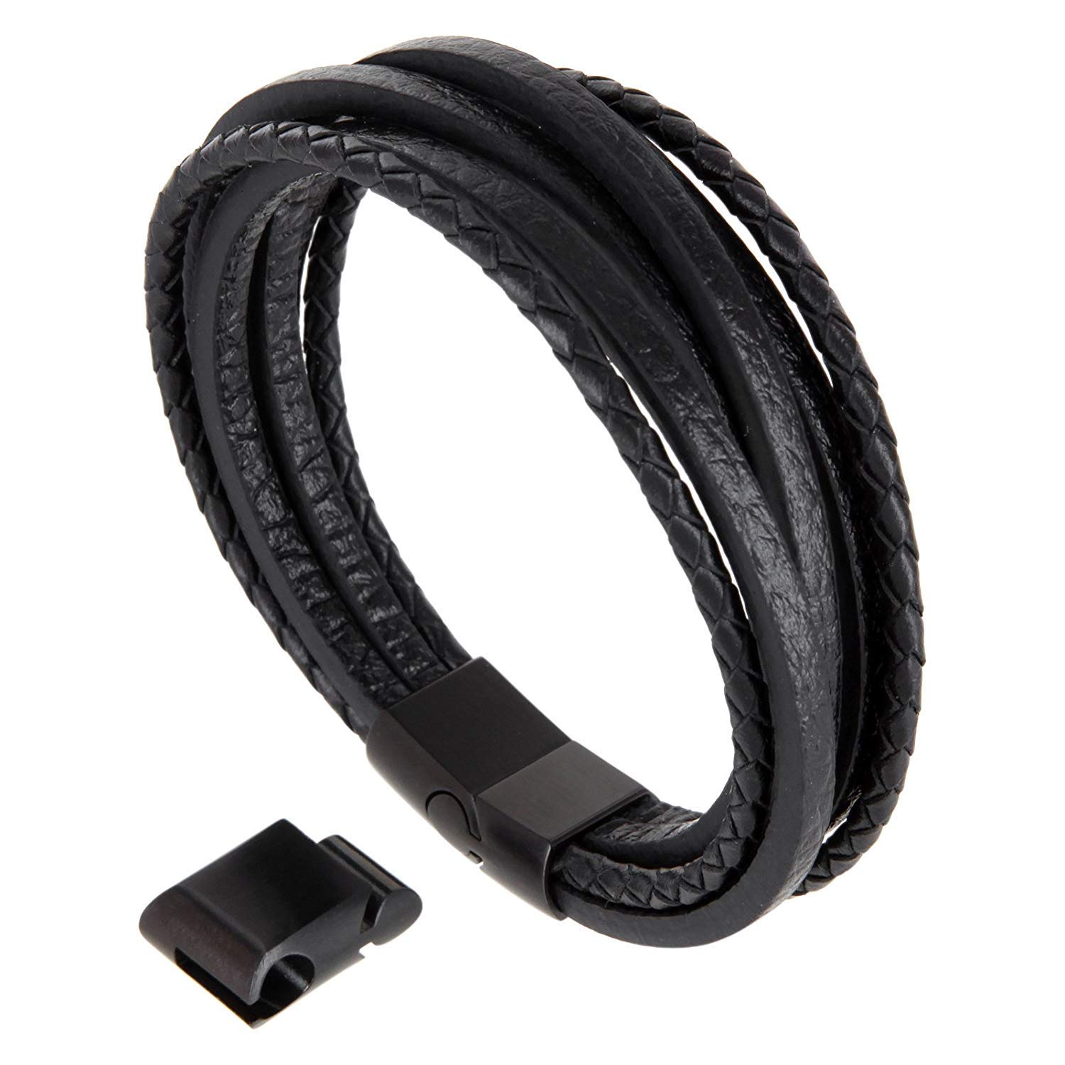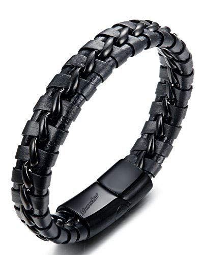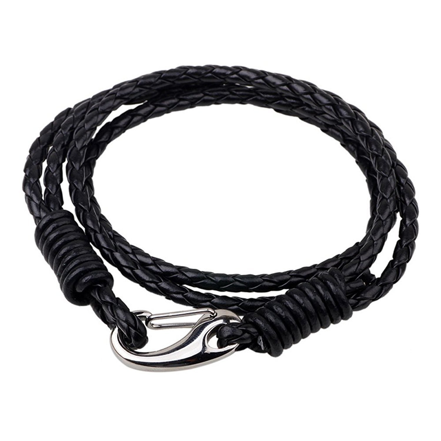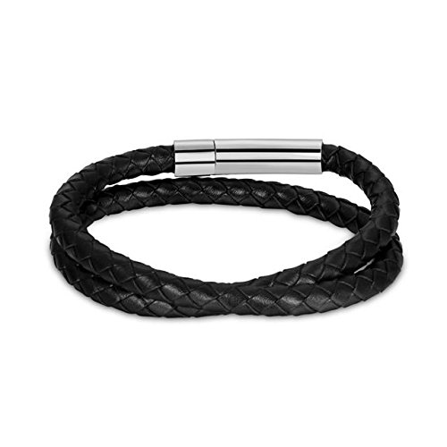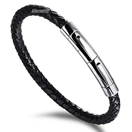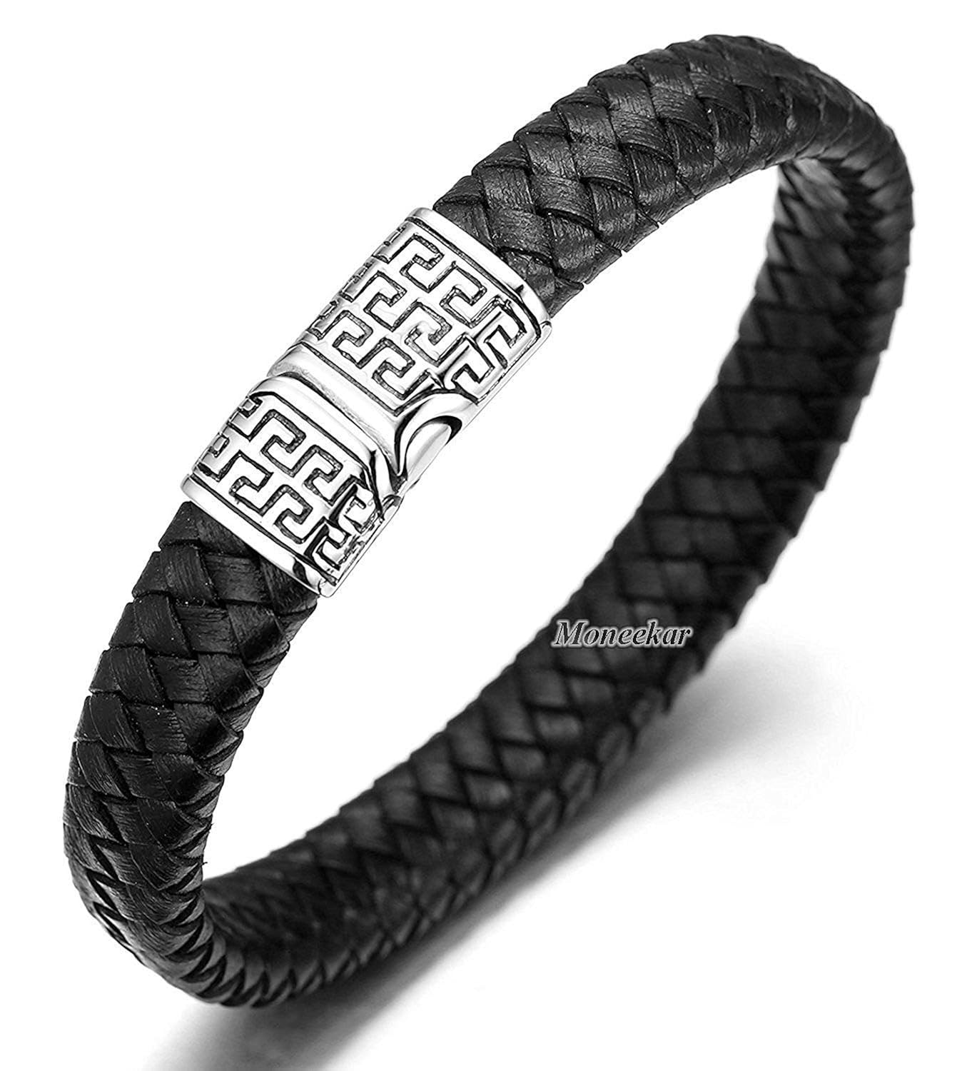 Moneekar Jewels Black Leather Braided Bracelet with Locking Silver Stainles...