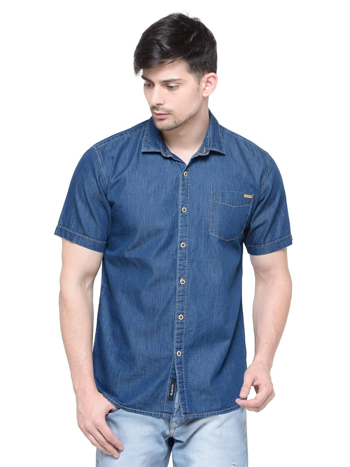 LA Seven Men's Cotton Solid Half Sleeves Slimfit Denim Shirt (Blue, 40)