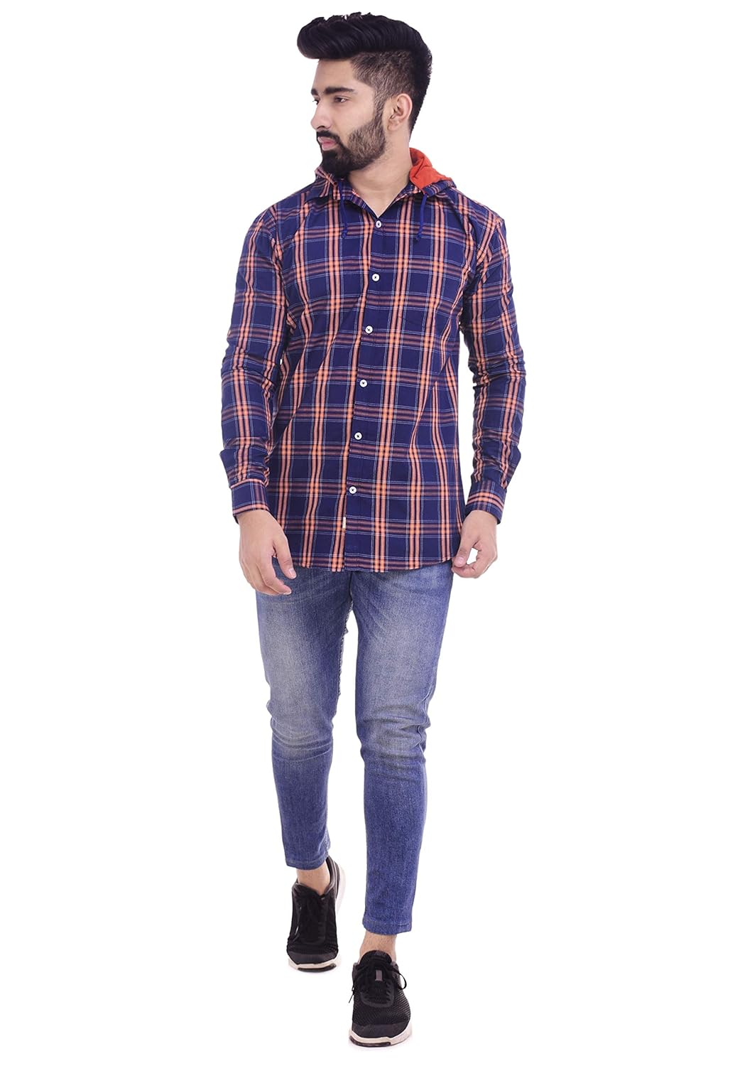 Blue Jorden Men's Checked Long Sleeves Button Closure Detachable Hoodie Shi...